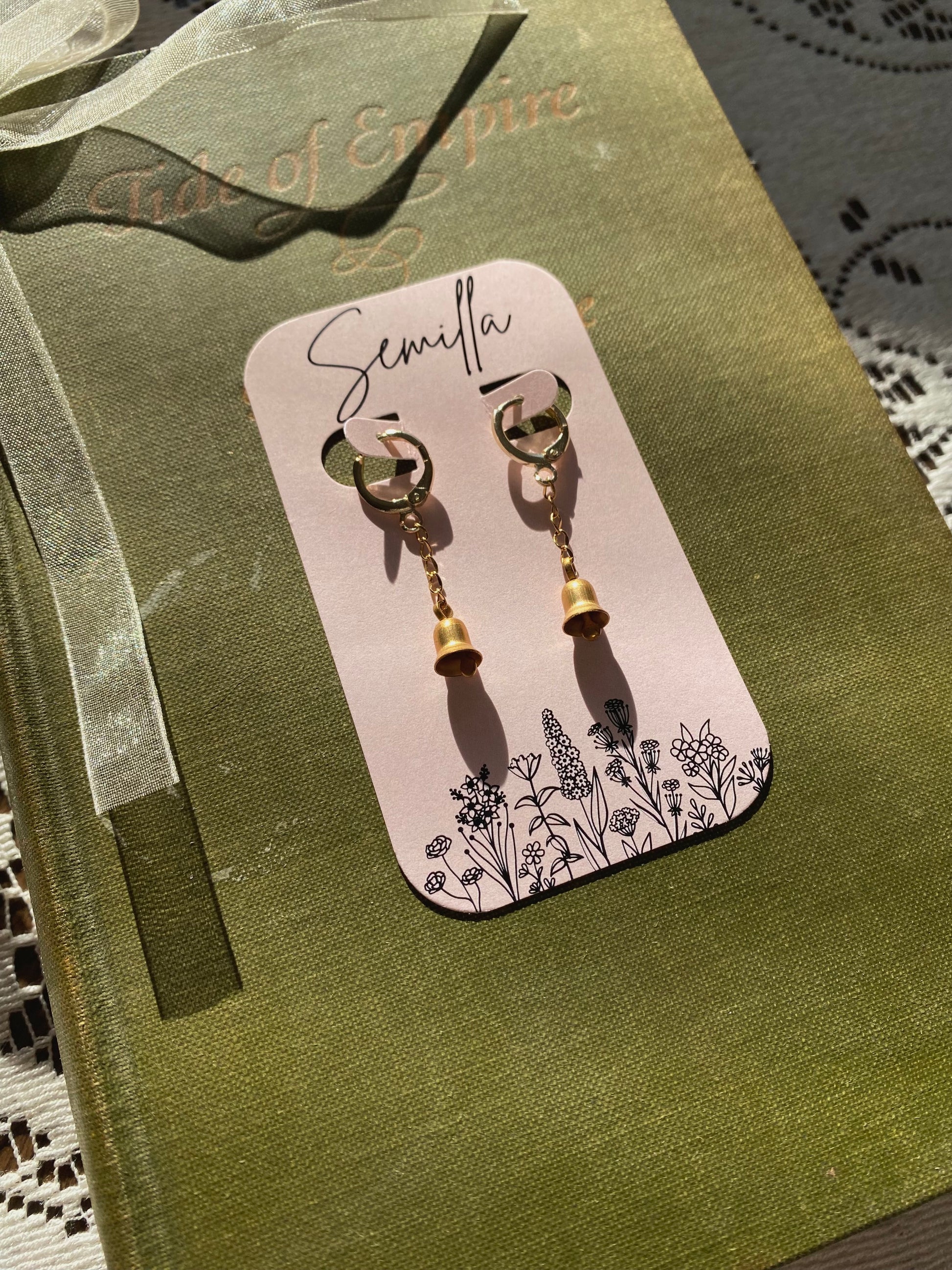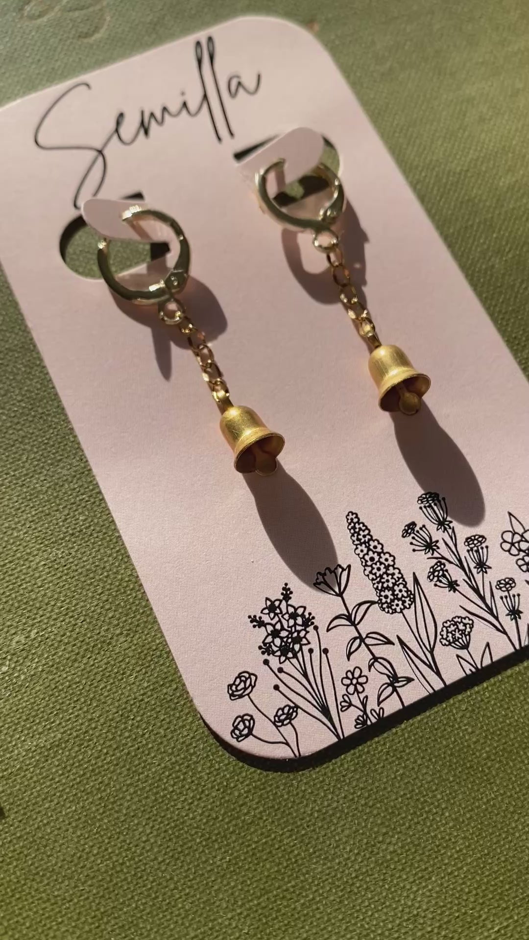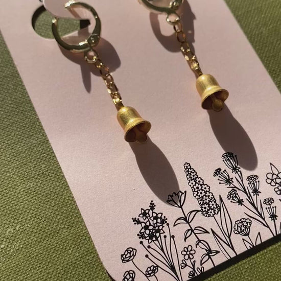a Vintage brass bell strung on a gold plated chain. The bell is very lightweight and does NOT actually ring, so don’t have to worry about hearing the jingling all day. Connected to a gold-plated hoop earring comfortable enough to sleep in! A versatile piece great for everyday wear and more formal events!