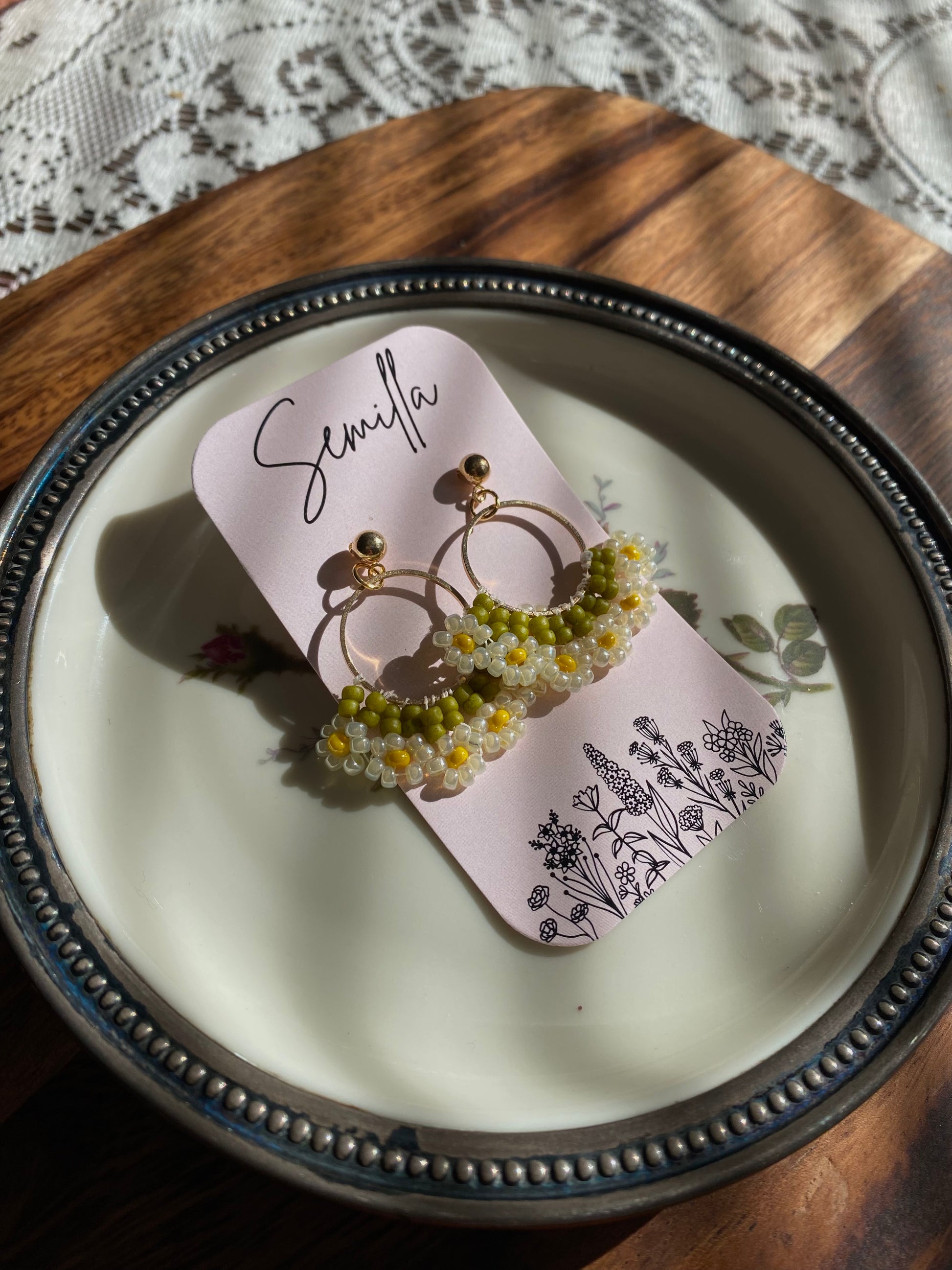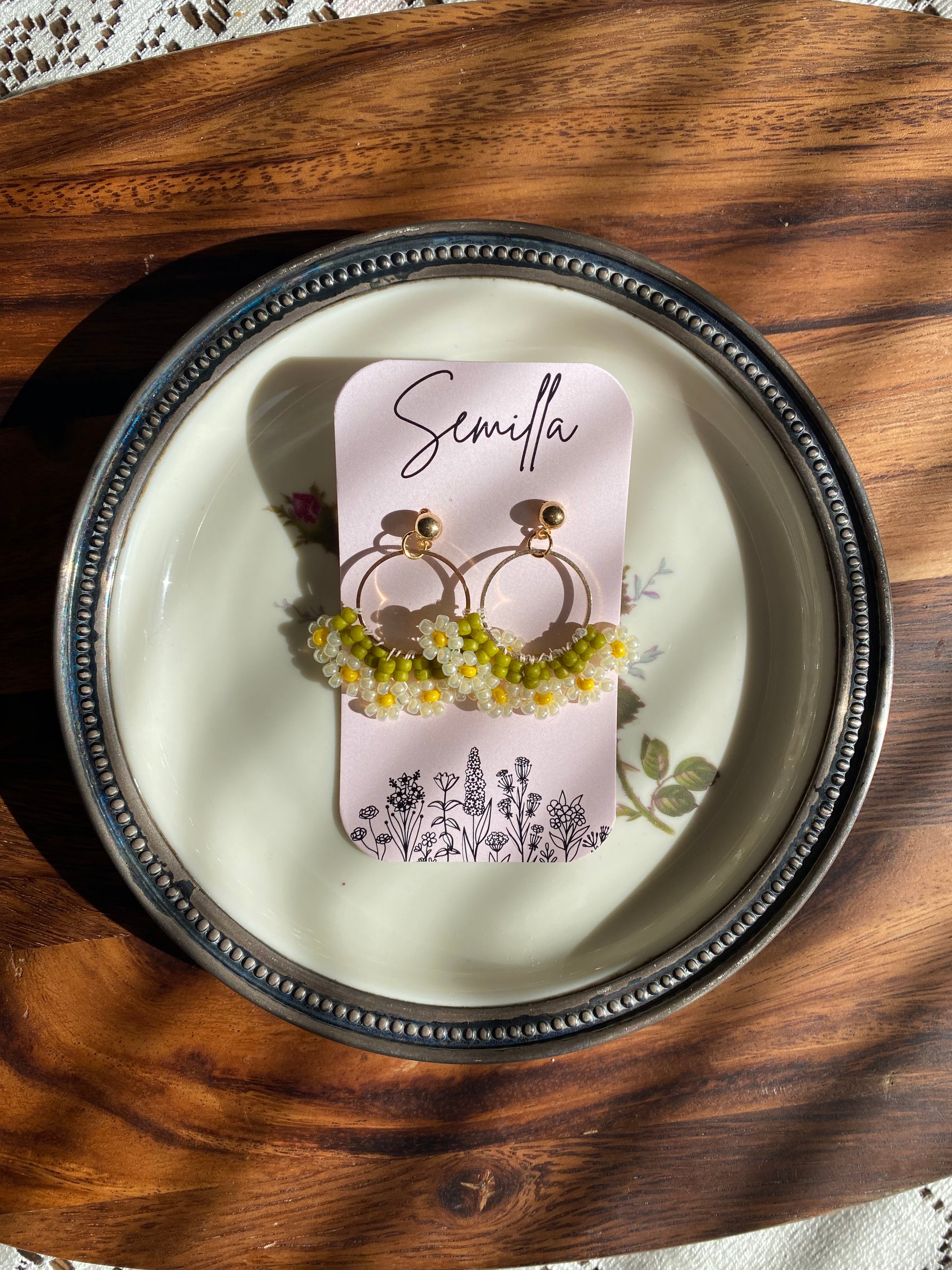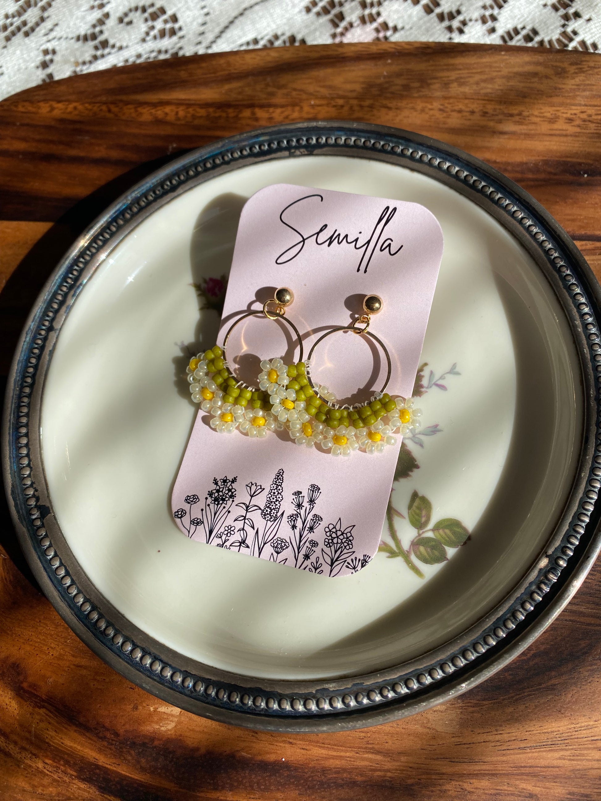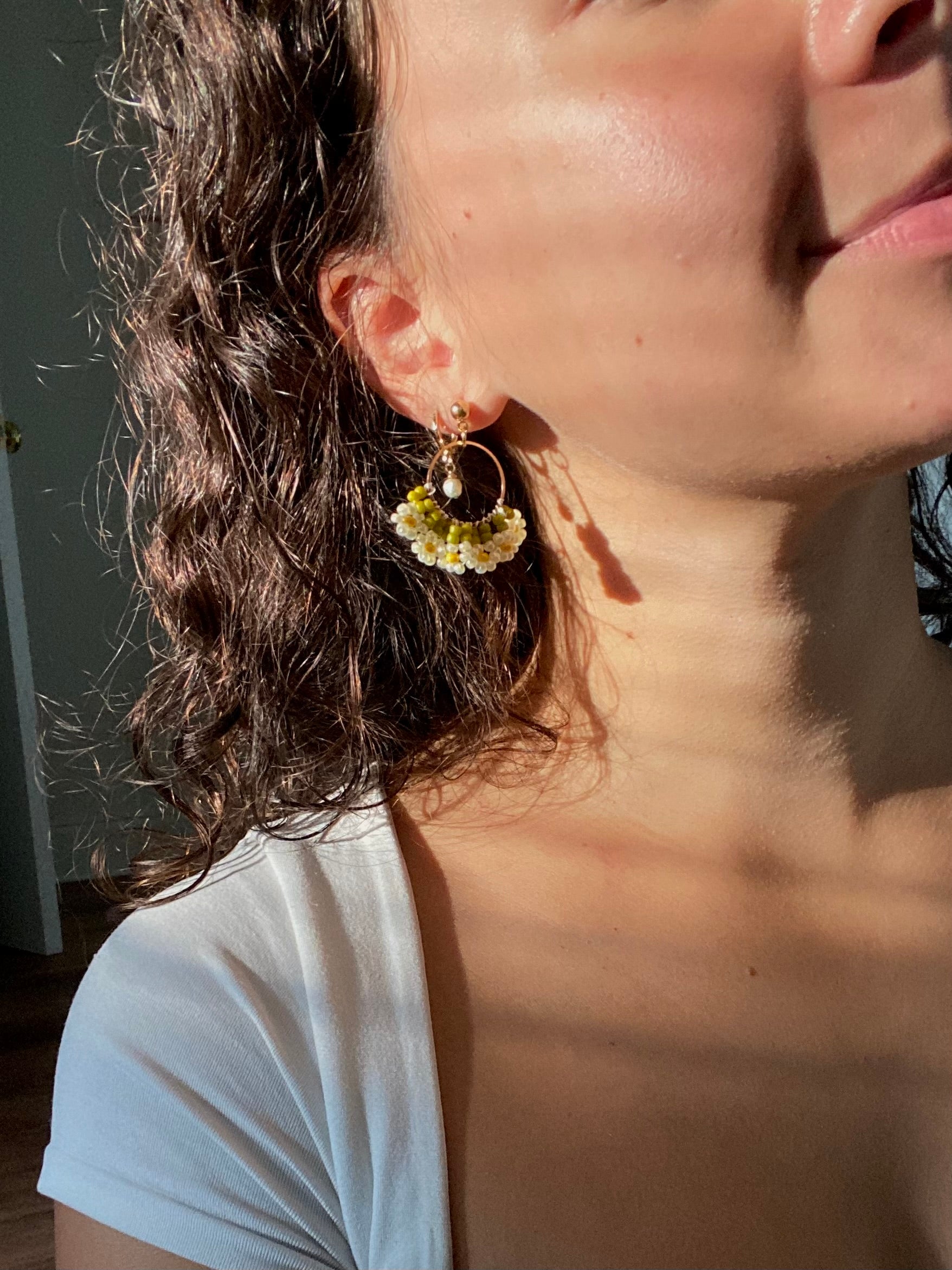 Hand beaded daisy chain rows on a brass hoop hanging from hypoallergenic gold-plated stud posts.