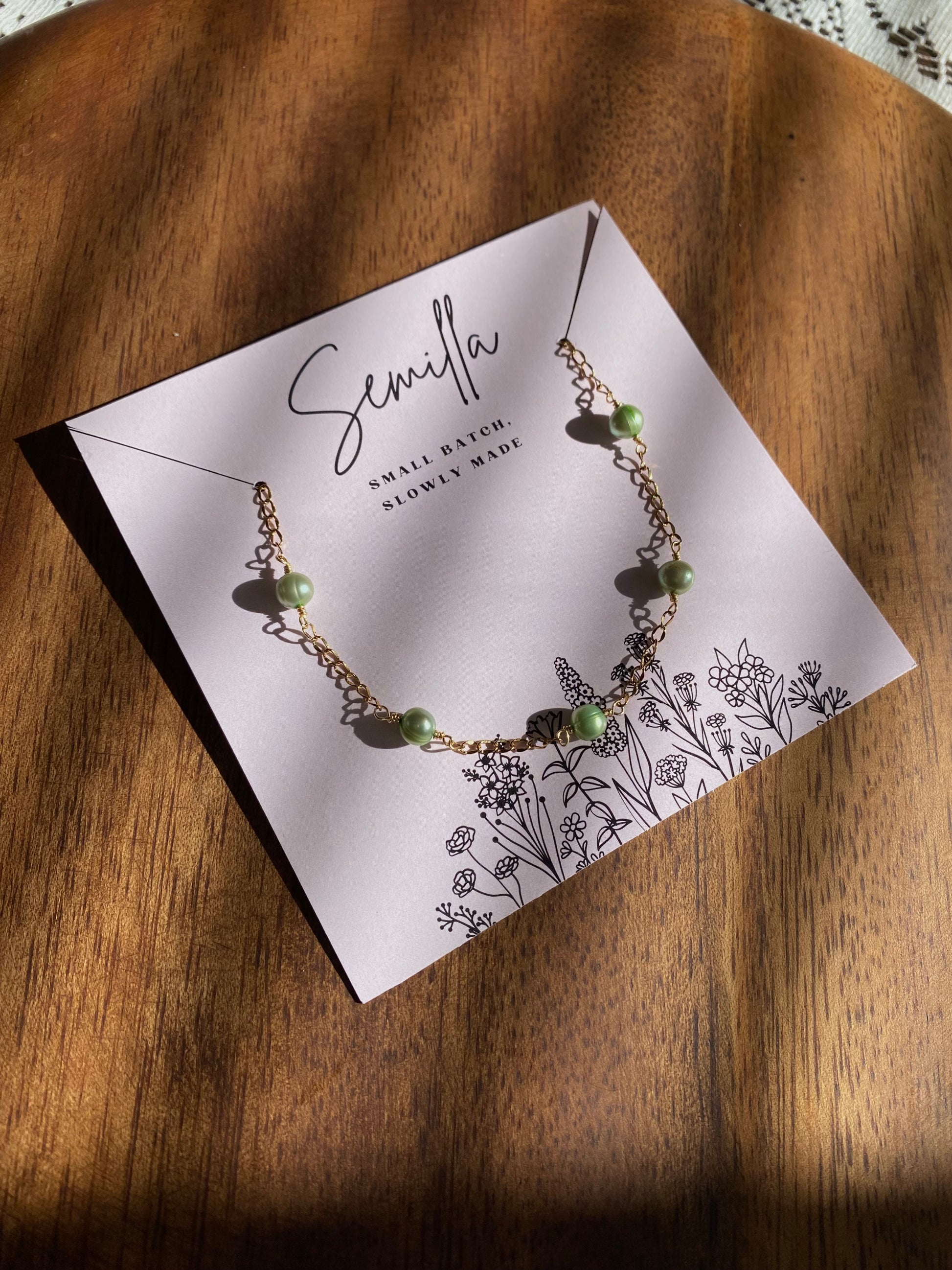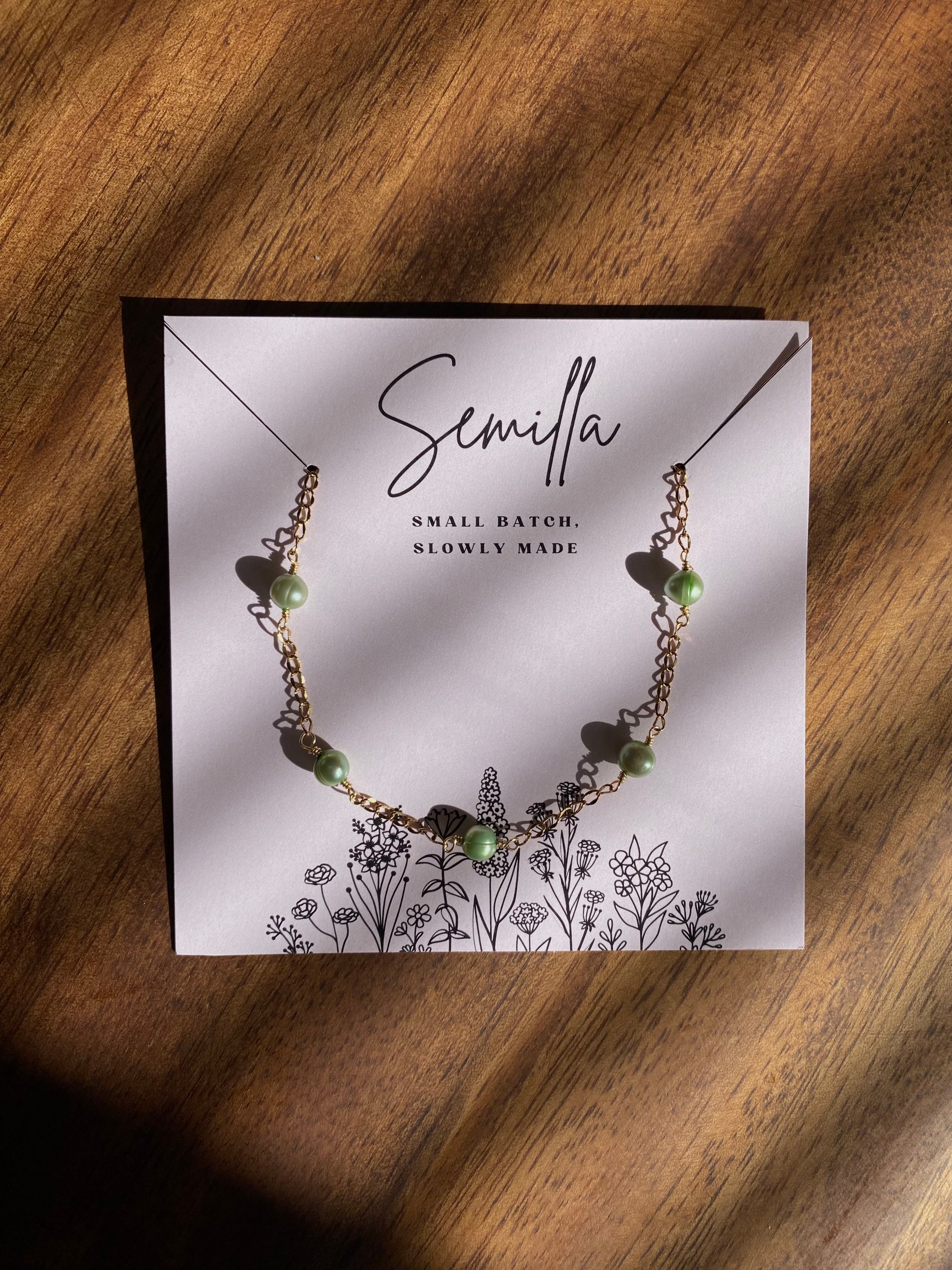 A trail of green freshwater pearls strung on a gold-plated chain. 15 inches + 2 inch extender.