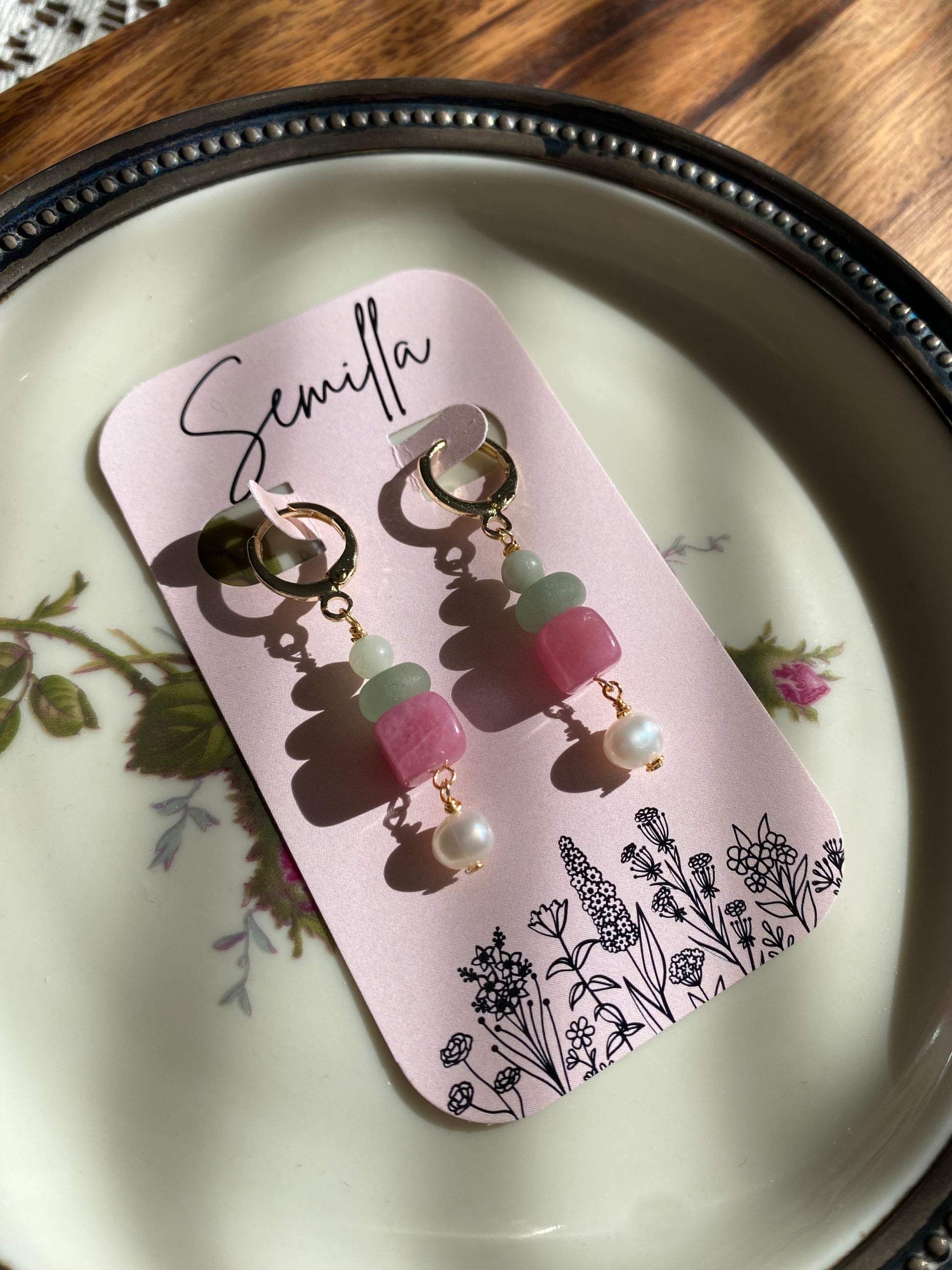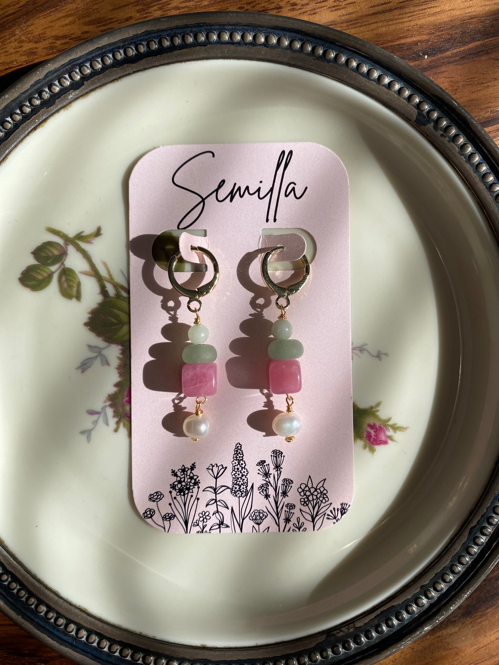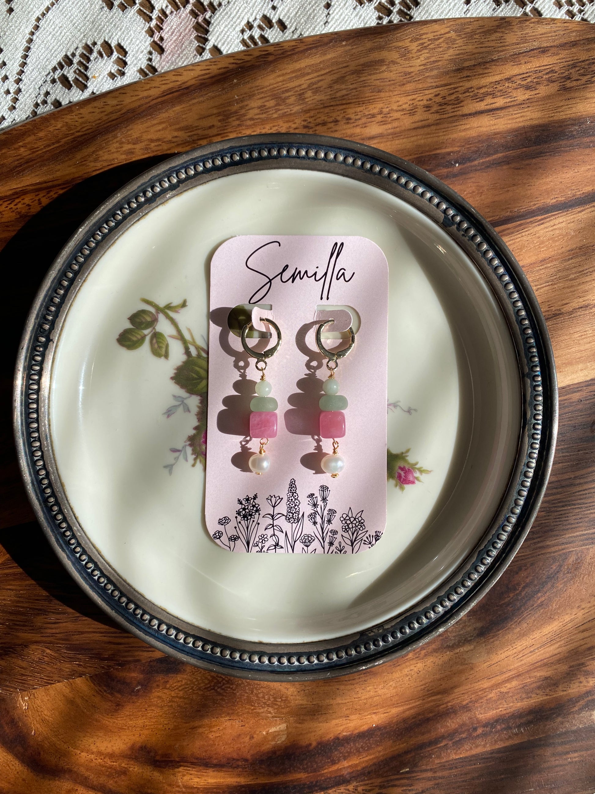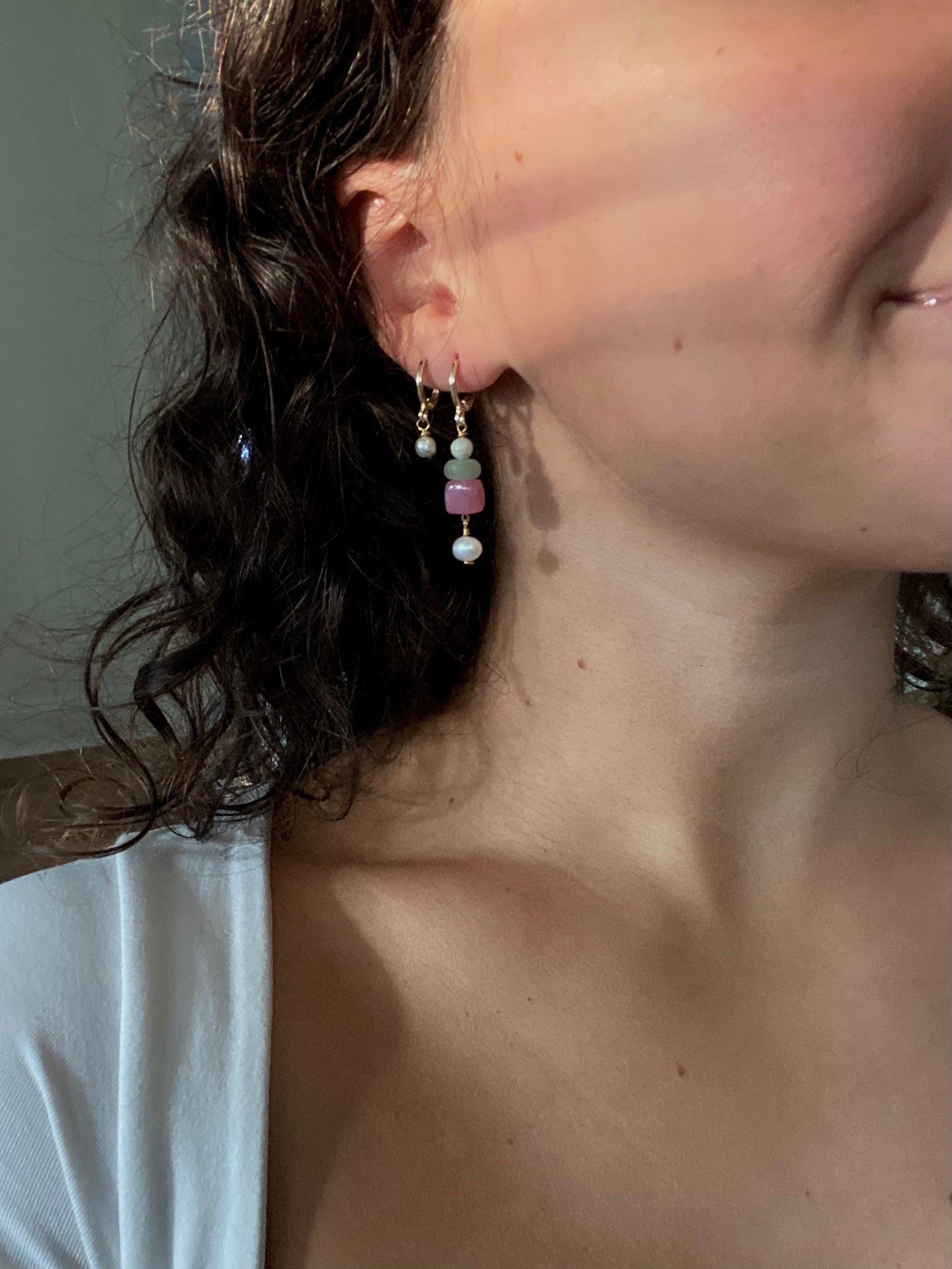 A mix of natural stone, glass, and freshwater pearls dangling from a gold filled huggie hoop! These are truly one of a kind because they feature a couple thrifted beads that I won’t get more of!