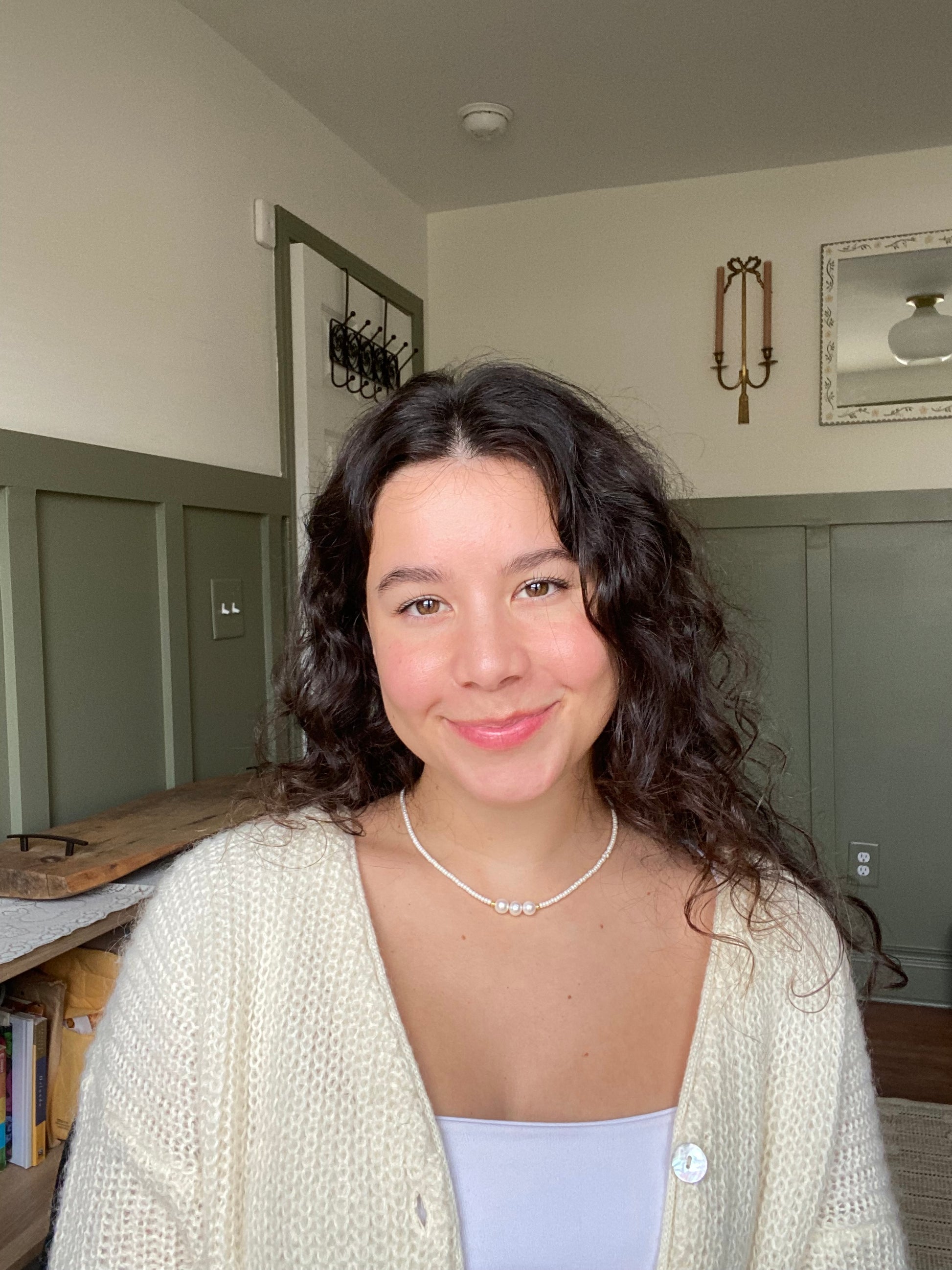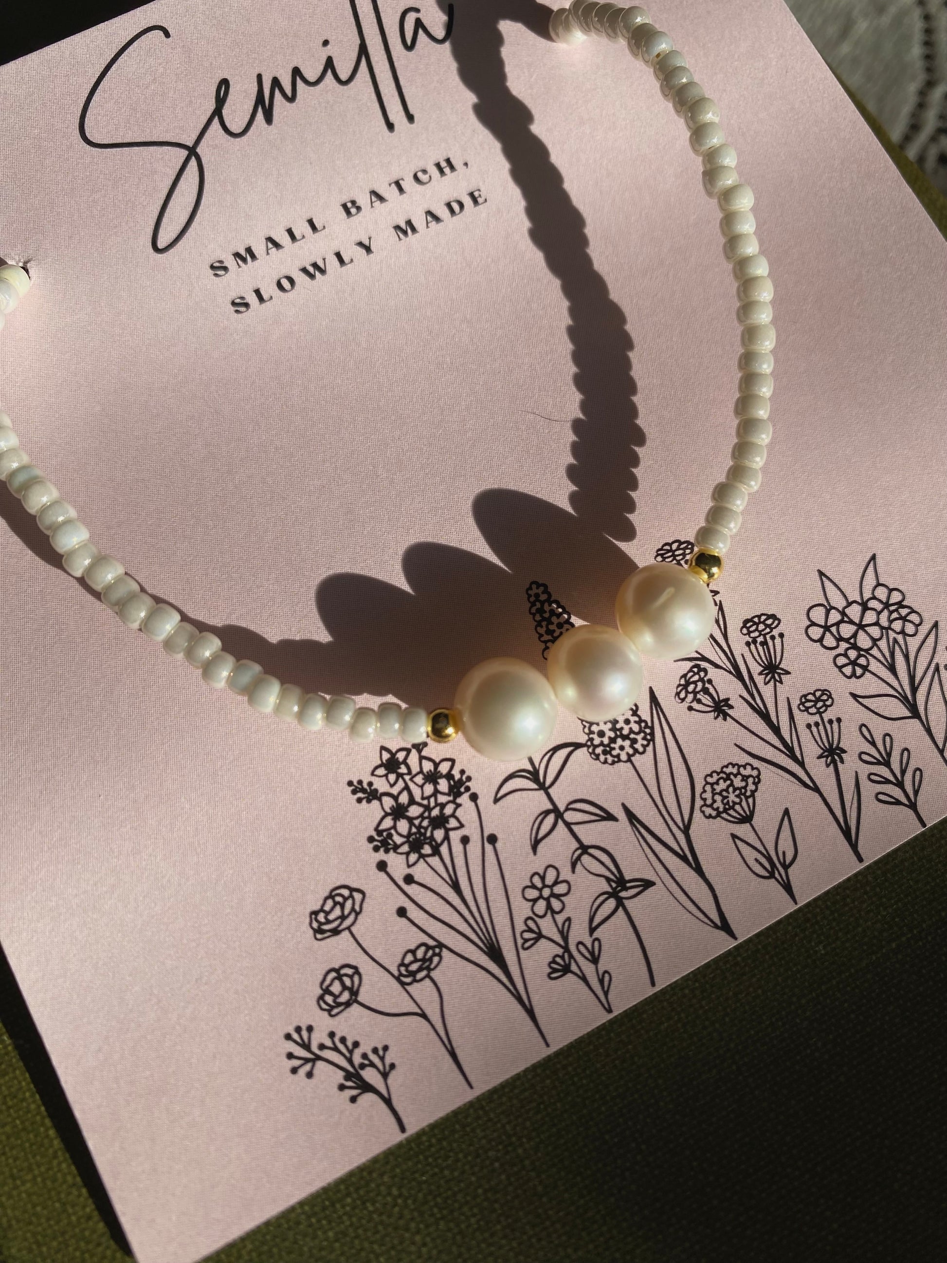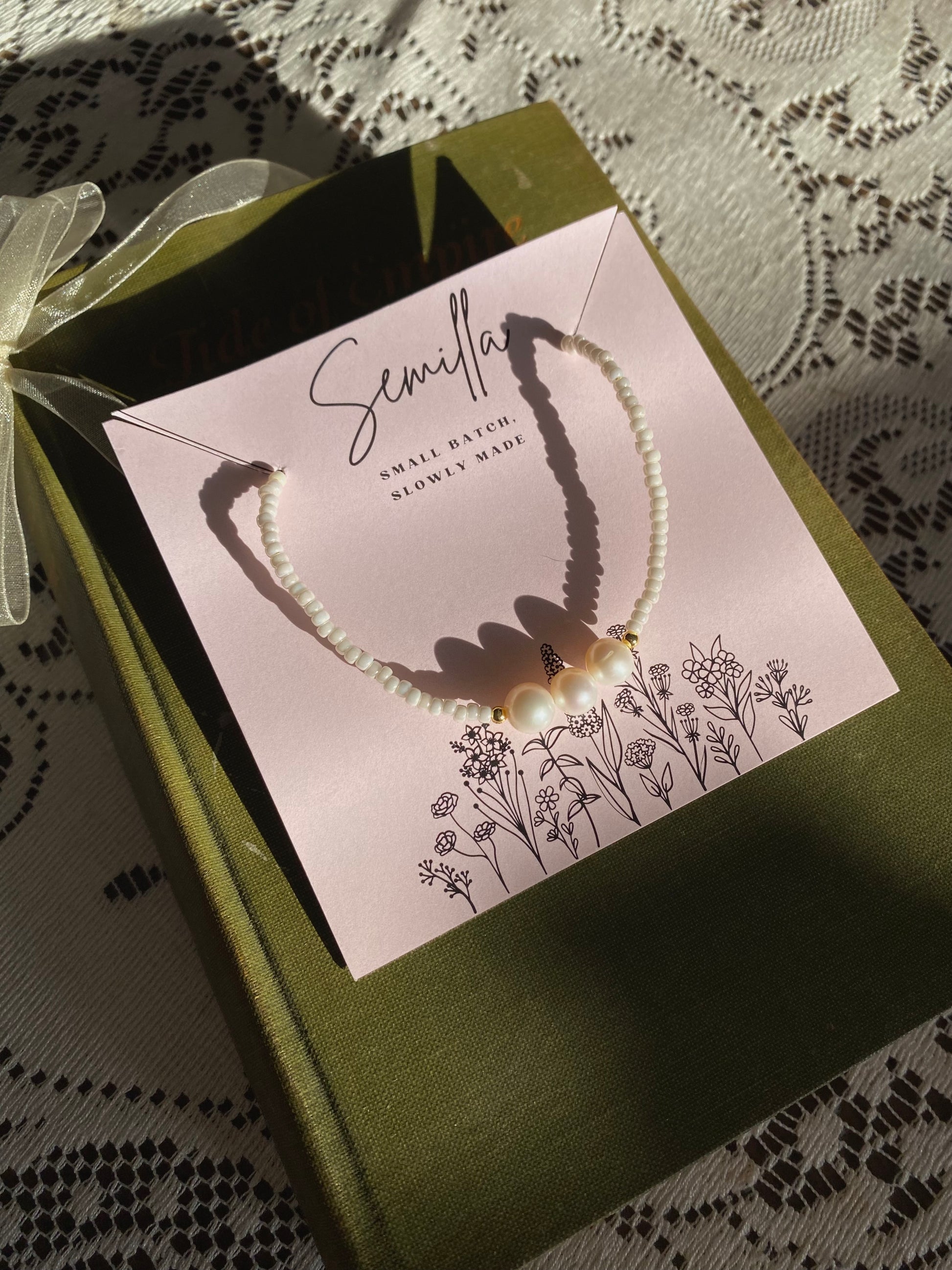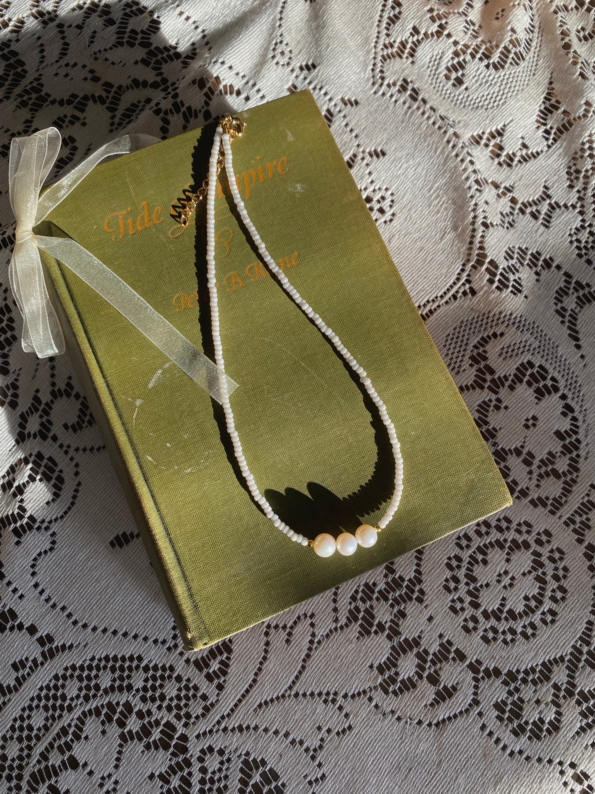 Opaque pearlized white seed beads with three freshwater pearls front and center! 14.5 inches + 2 inch extender. Gold-plated findings.