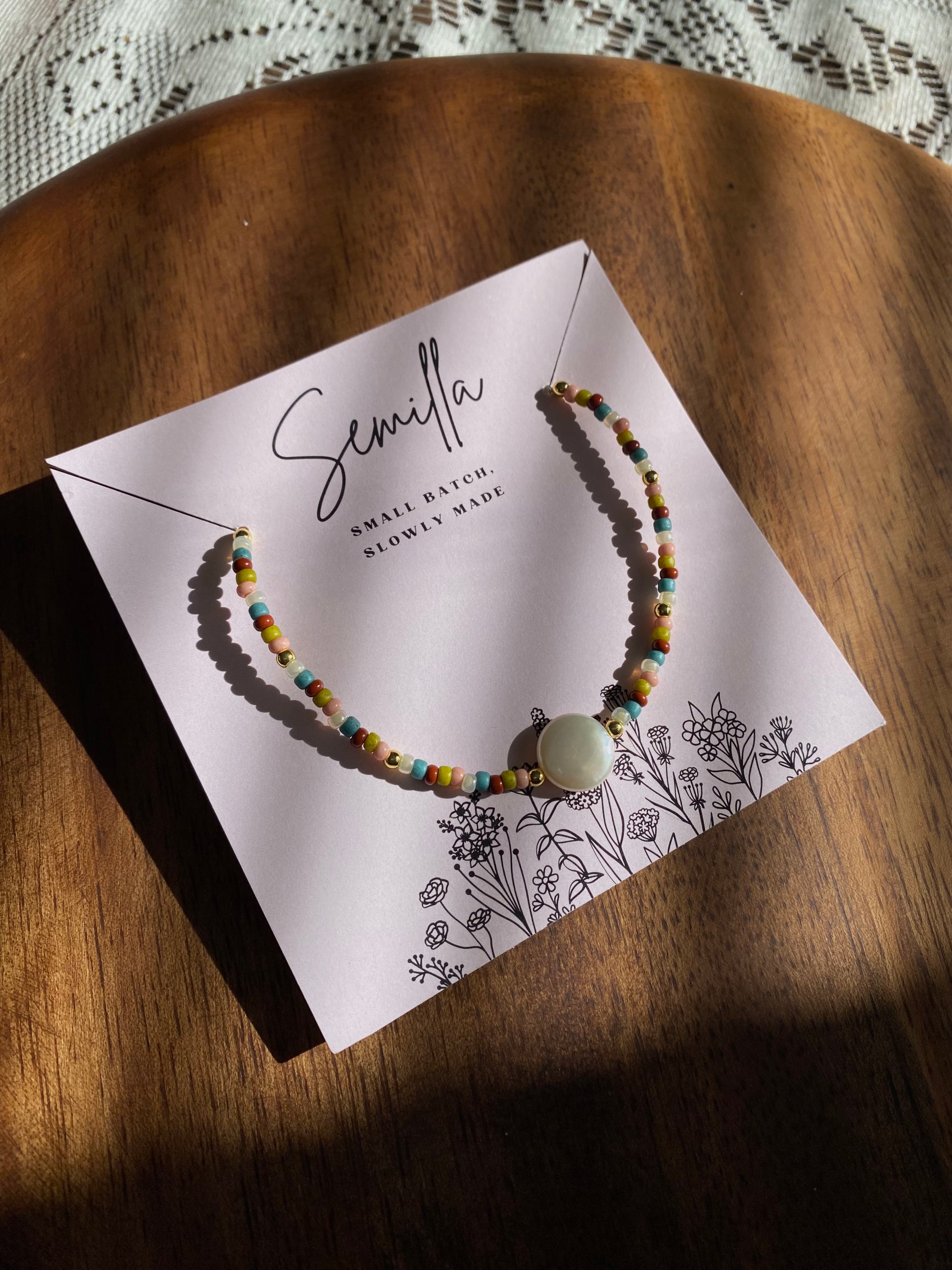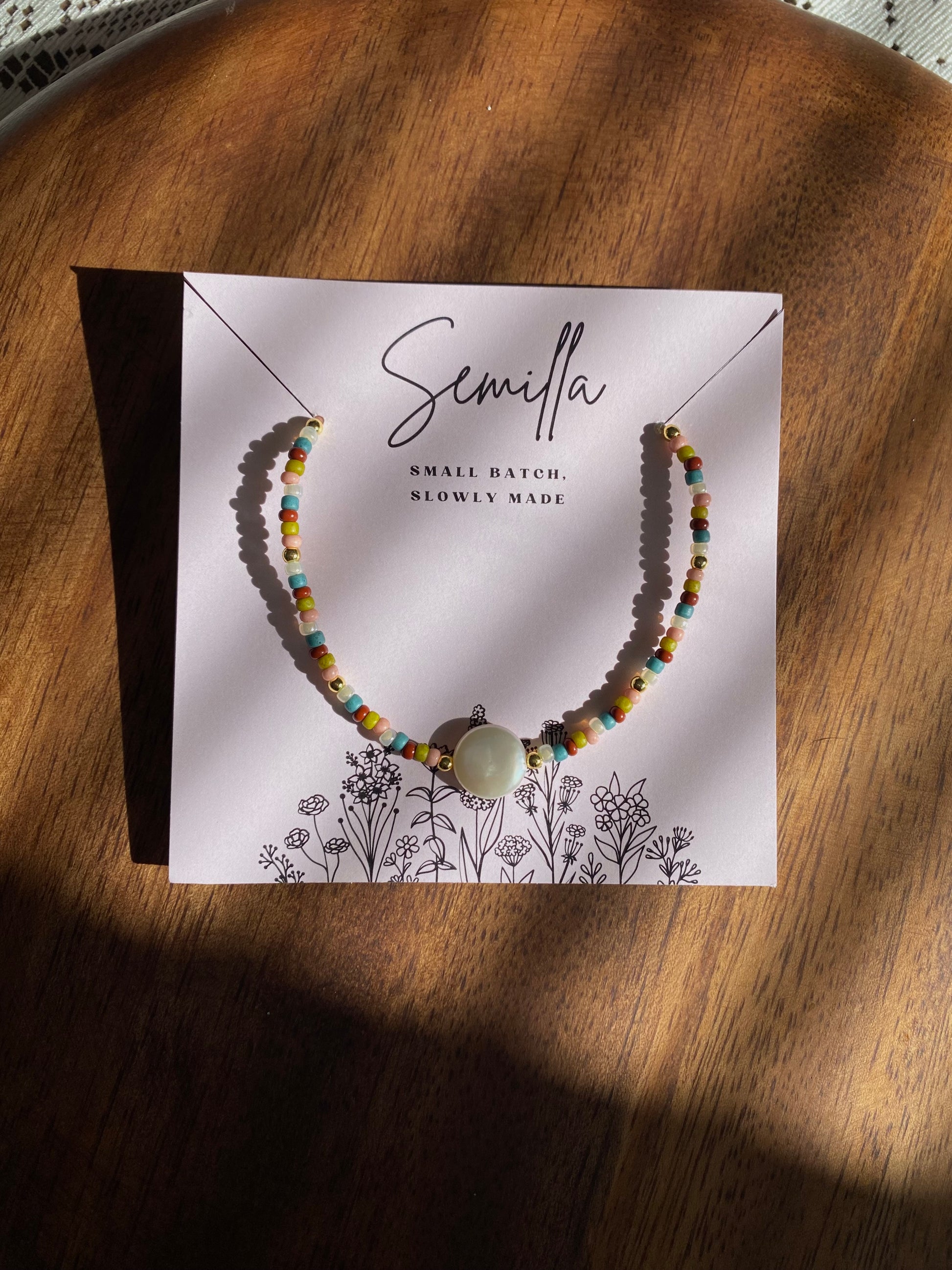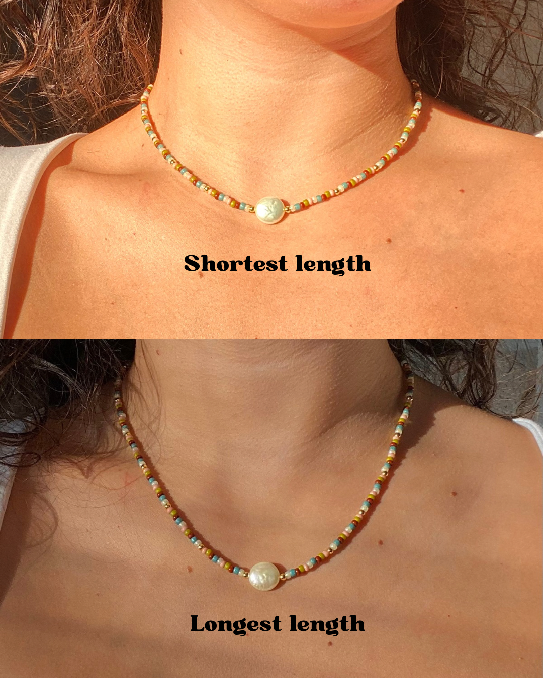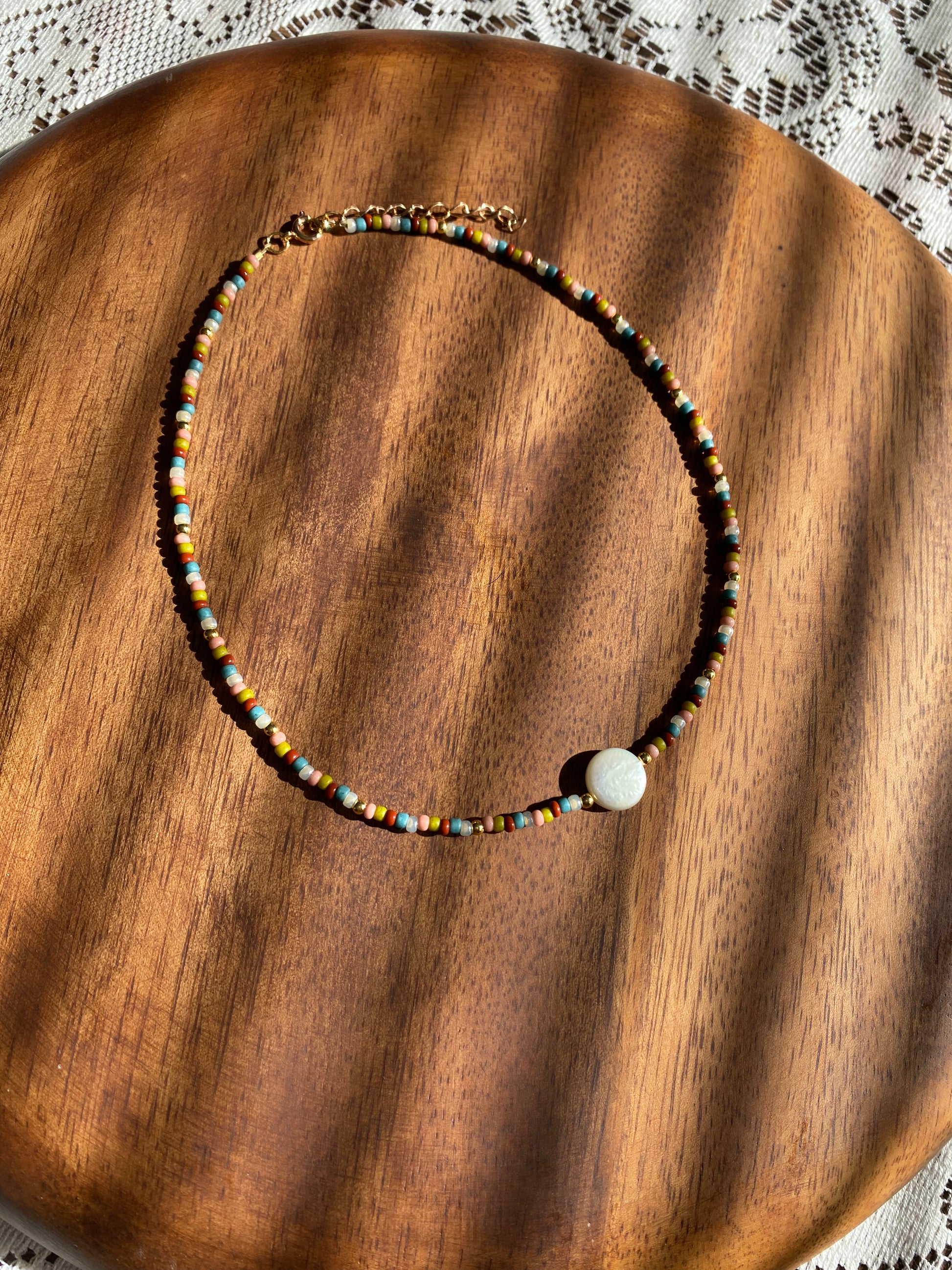 A mixture of chocolate brown, olive green, pale pink, blue, gold, and pearl seed beads surrounding a singular coin freshwater pearl. Gold-plated findings and 16 inches + 2 inch extender.