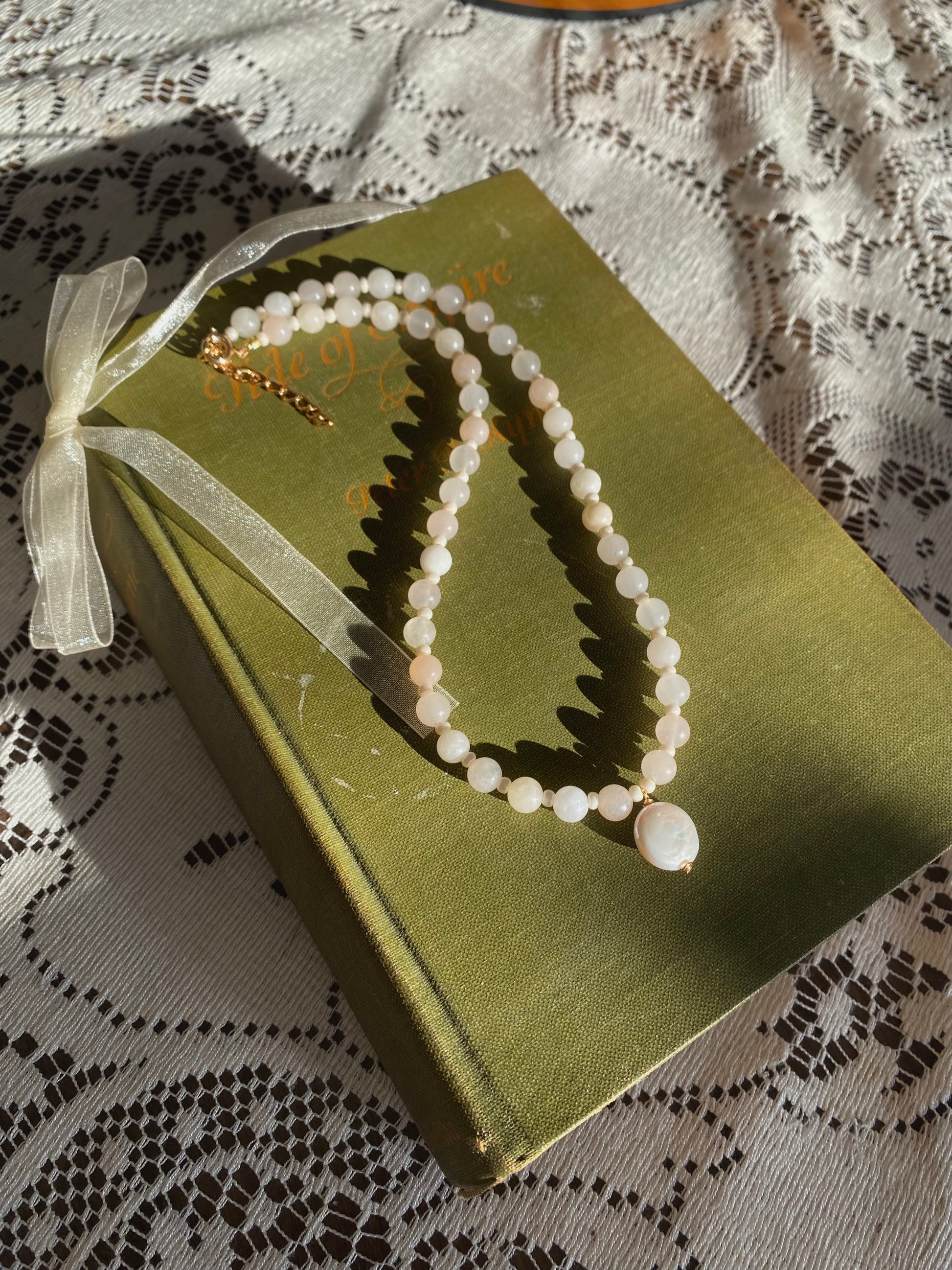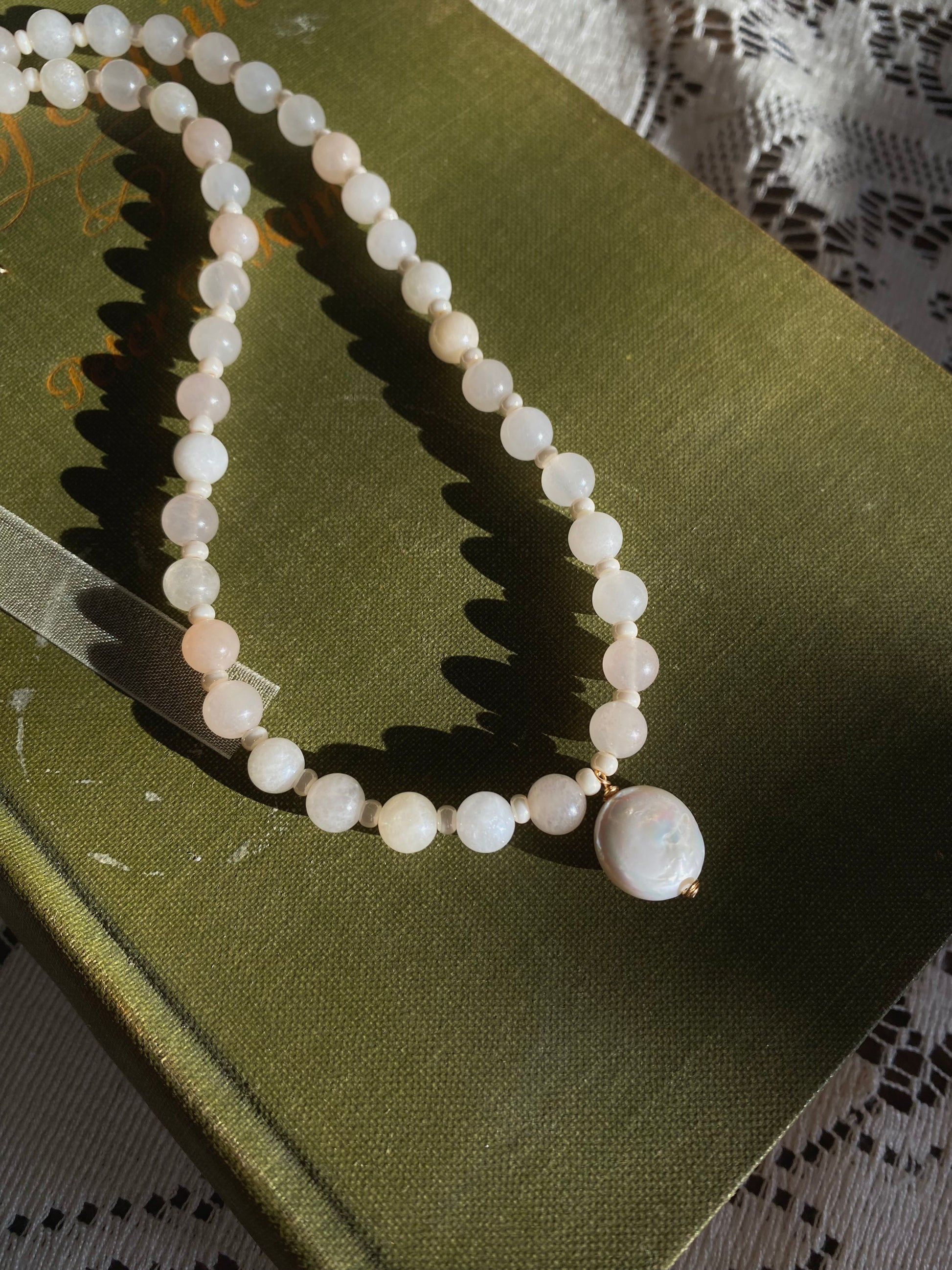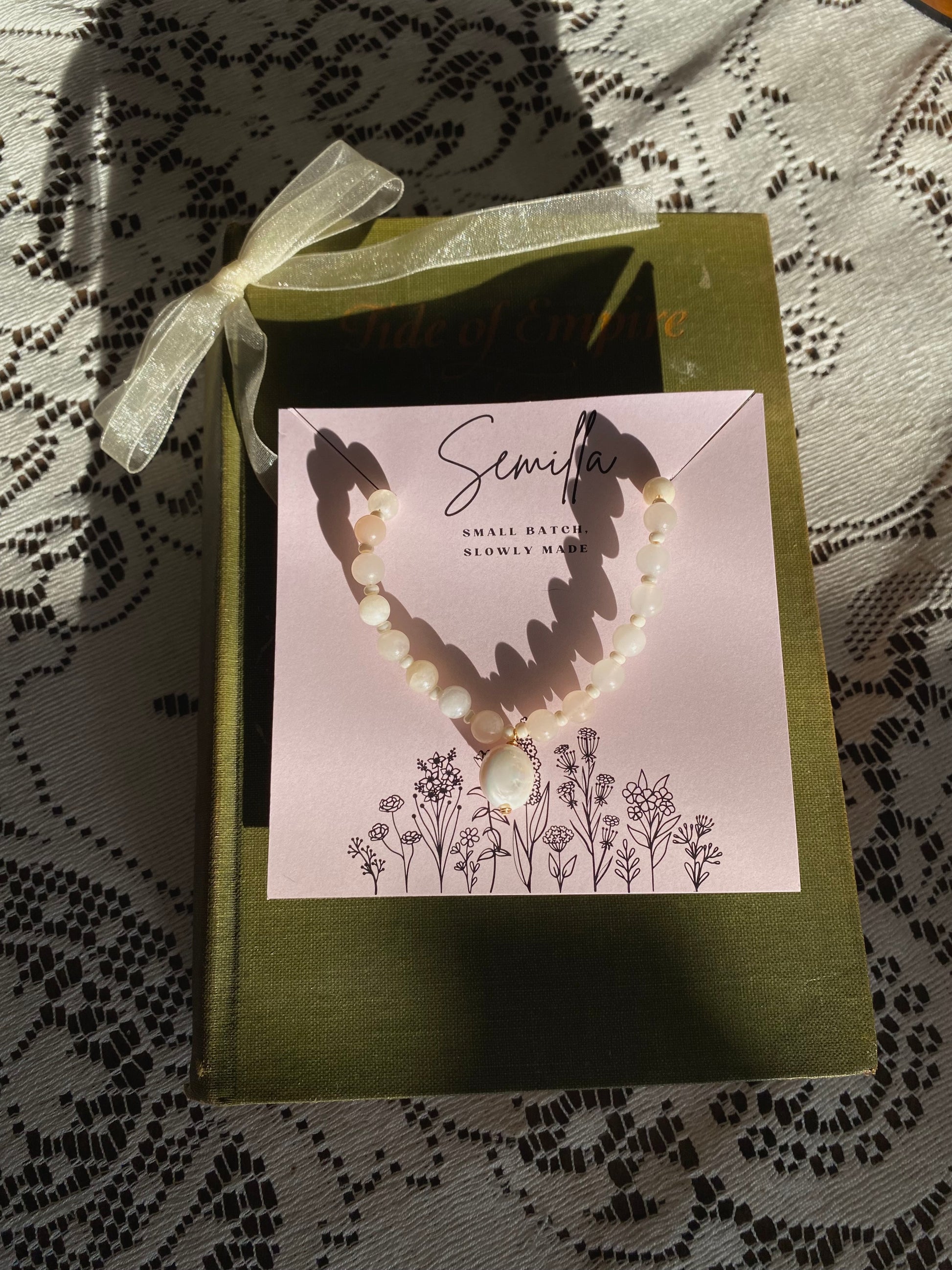 The Perla features polished quartz spheres sandwiched in between pearlized white seed beads and a round freshwater pearl disk hanging front and center. Each necklace is totally unique due to the variety in each quartz bead. 16 inches + 2 inch extender. Gold-plated findings.