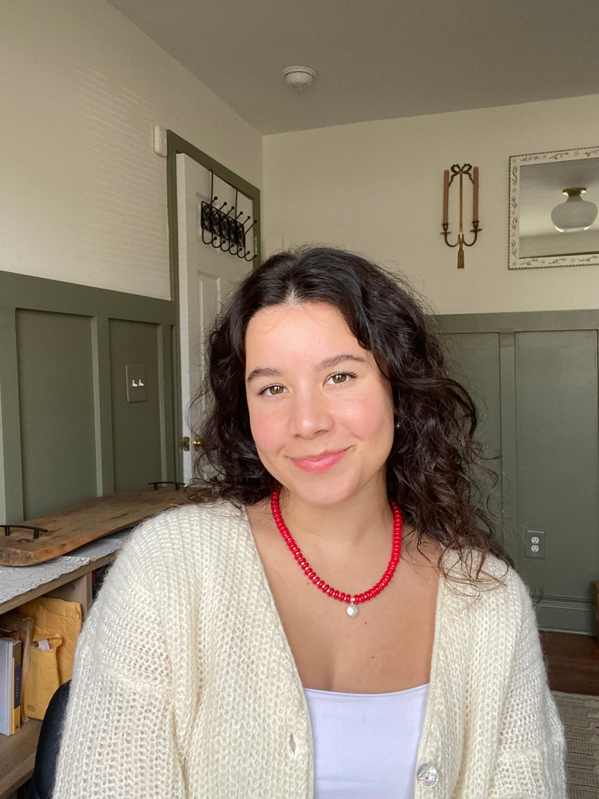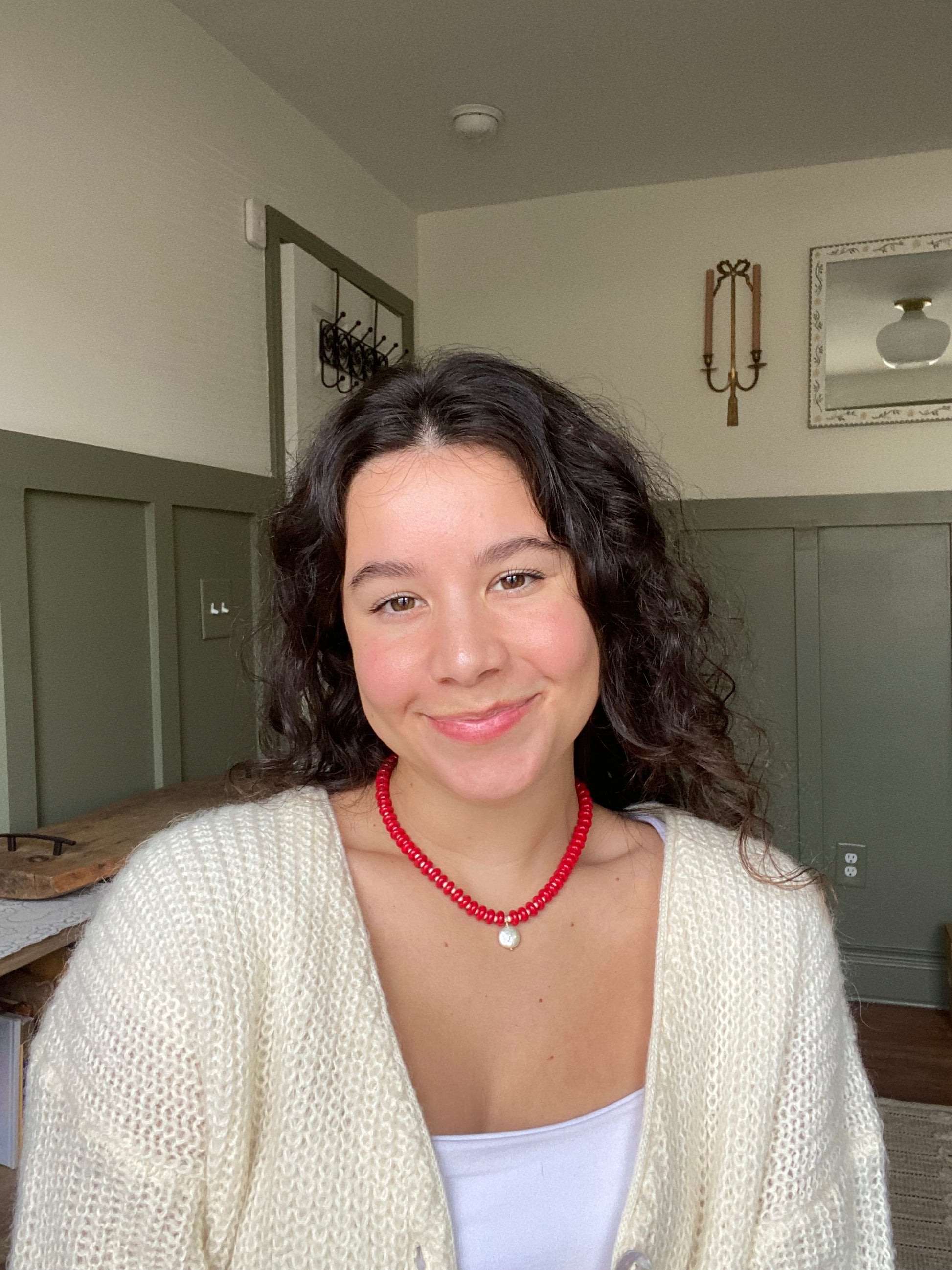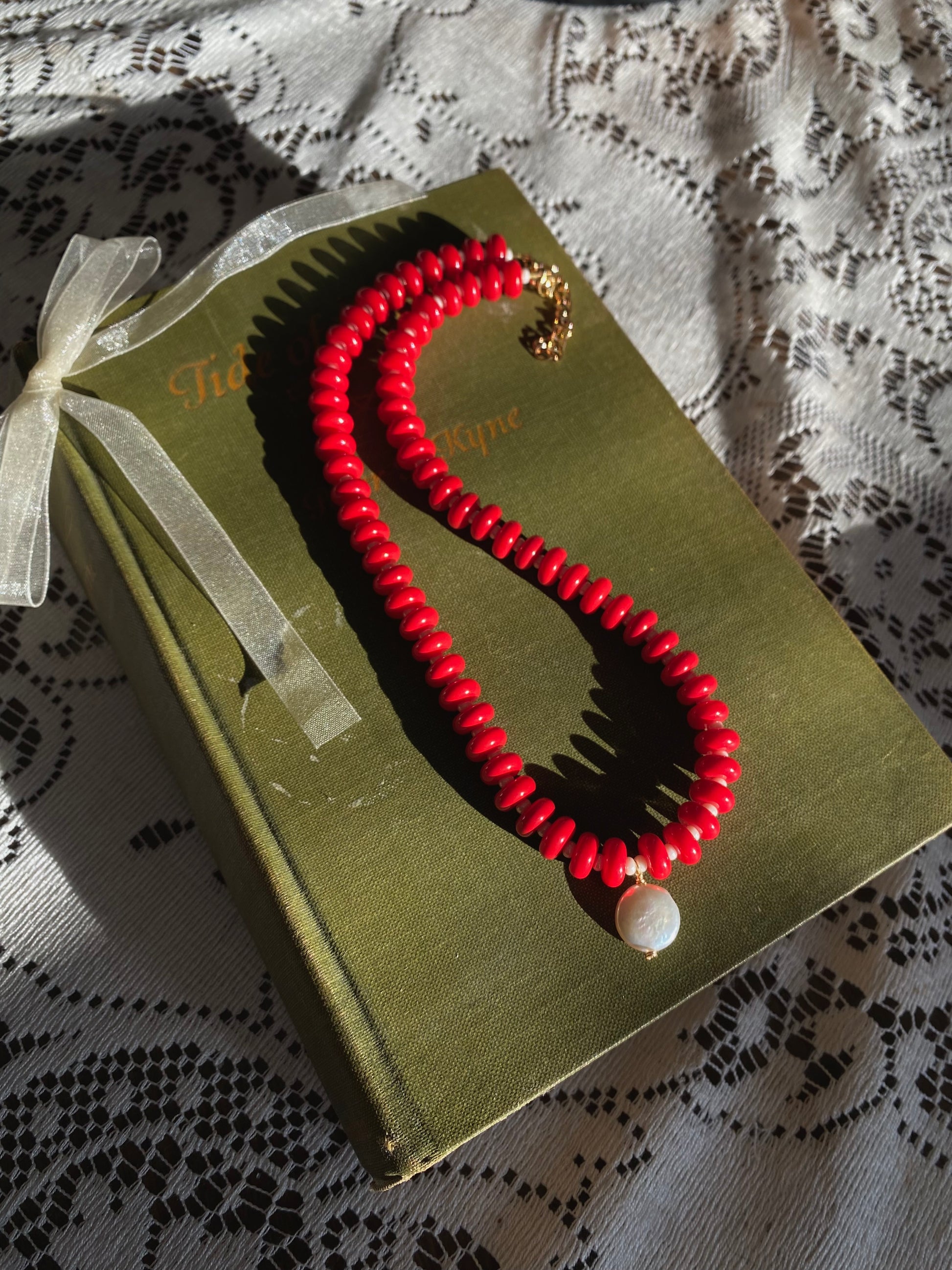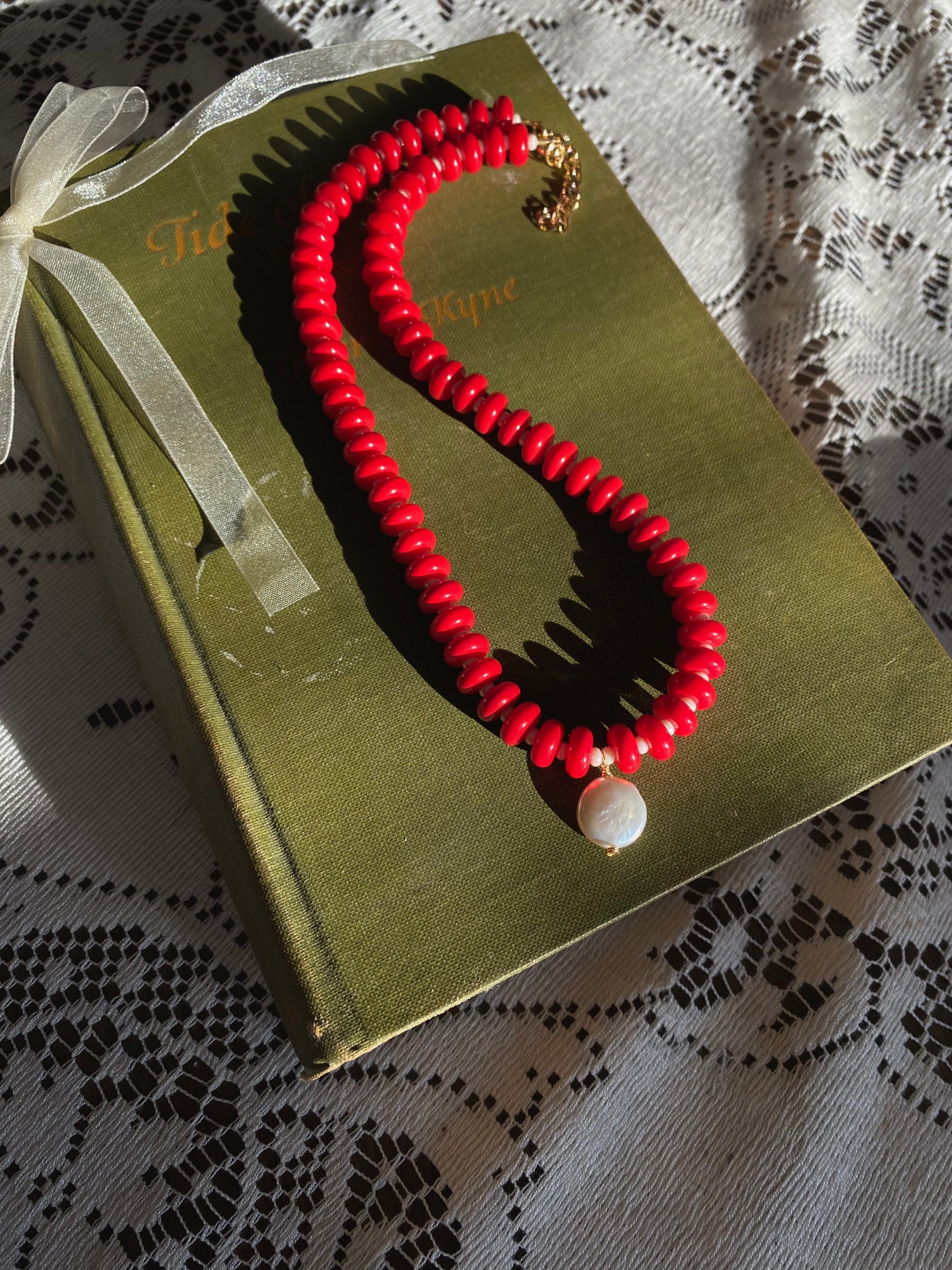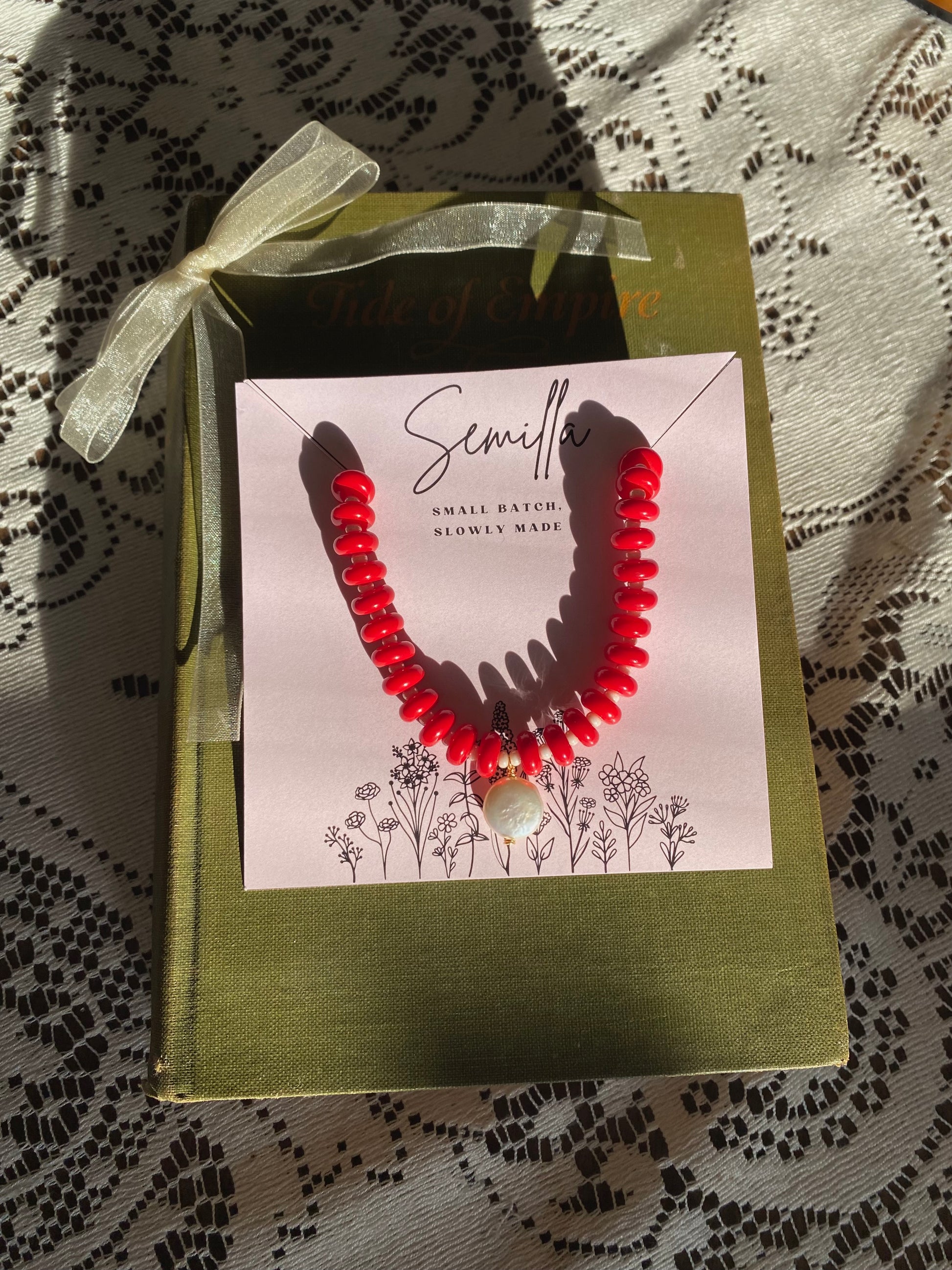 A chunky necklace lover’s dream! The Pura features glossy red glass rondelle beads sandwiched in between pearlized white seed beads and a round freshwater pearl disk hanging front and center. 16 inches + 2 inch extender. Gold-plated findings.