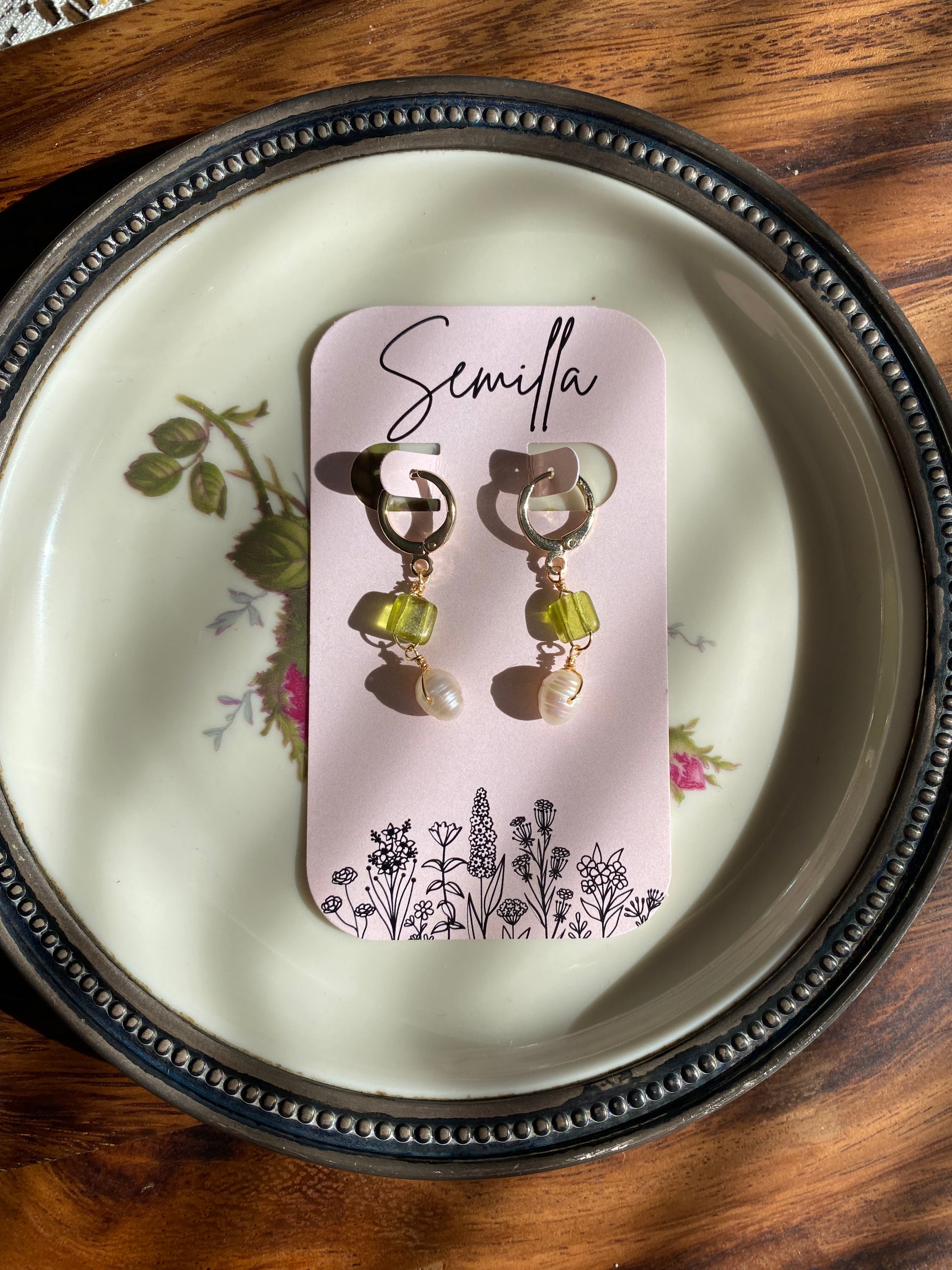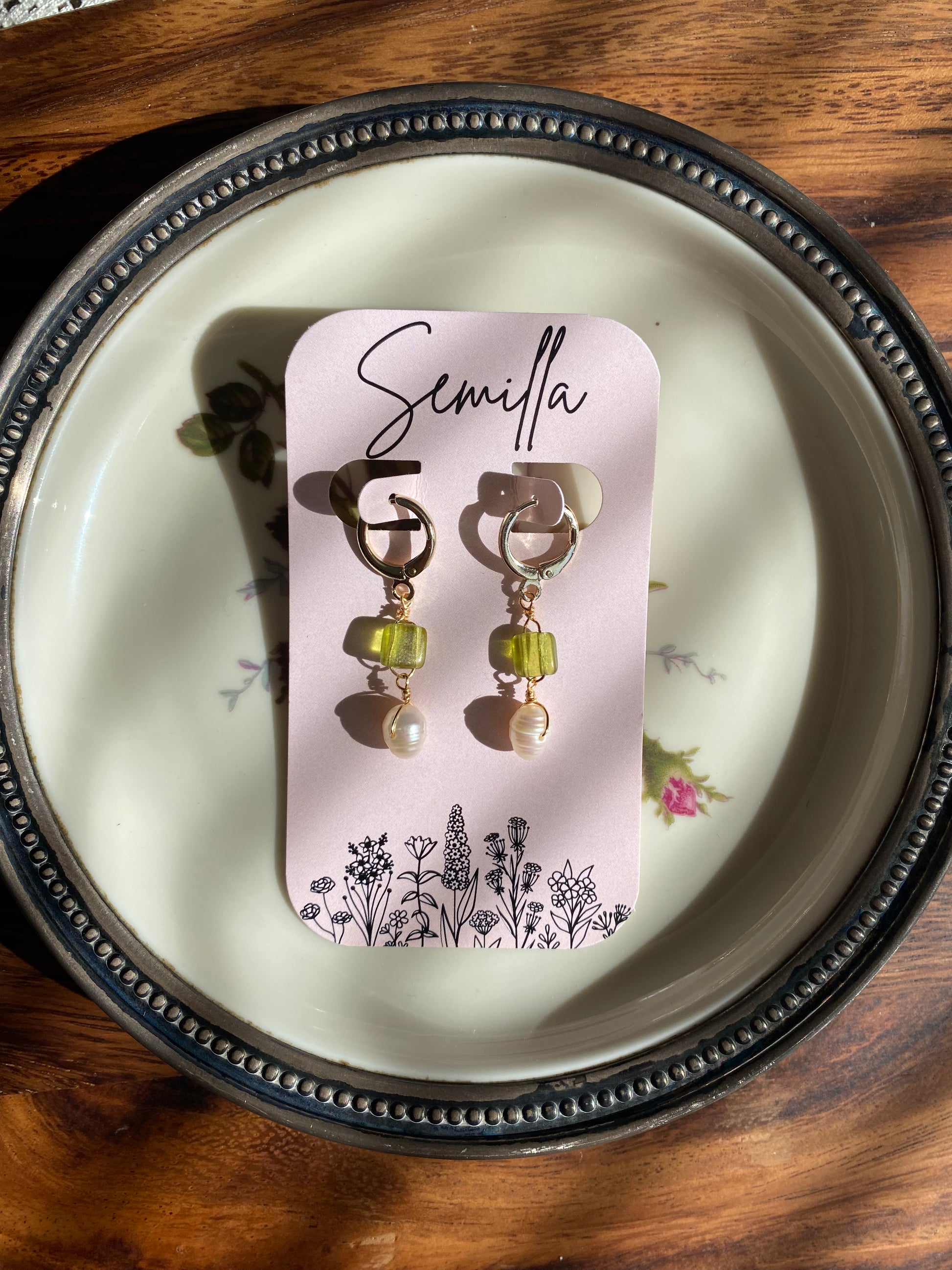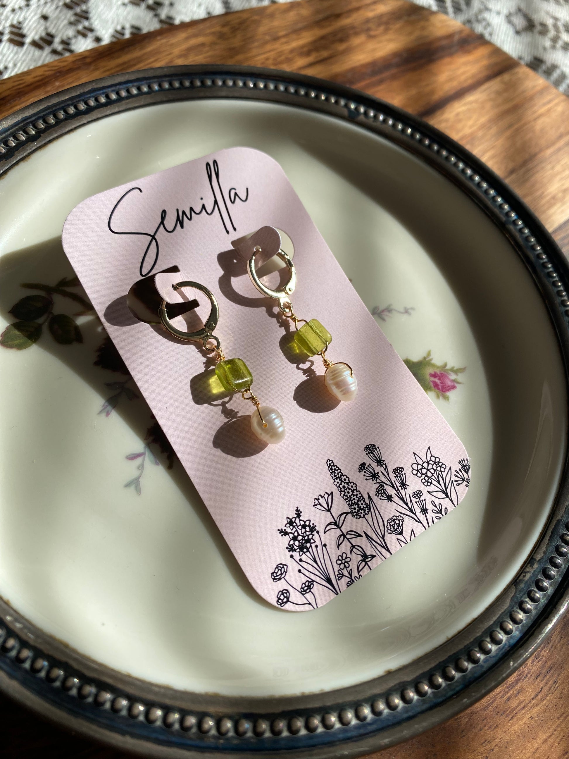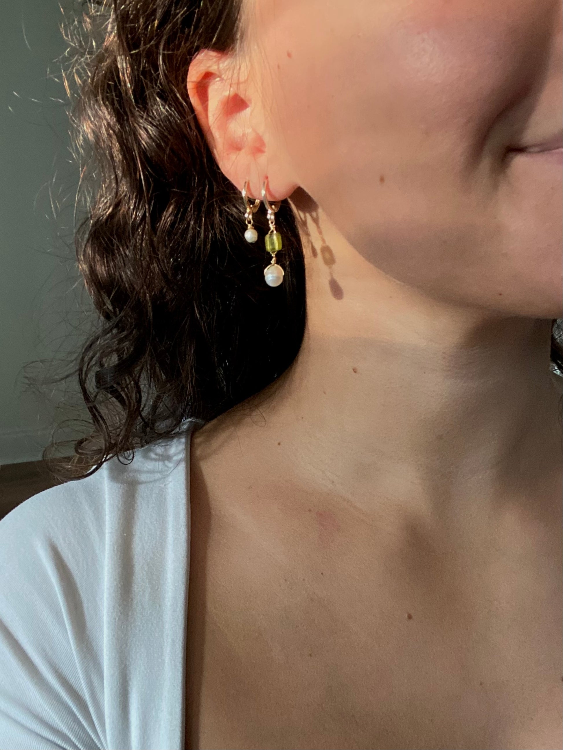 A bright olive green glass beads and freshwater pearls dangling from gold filled huggie hoops. Each pearl is it’s own unique shape, which makes every pair unique!