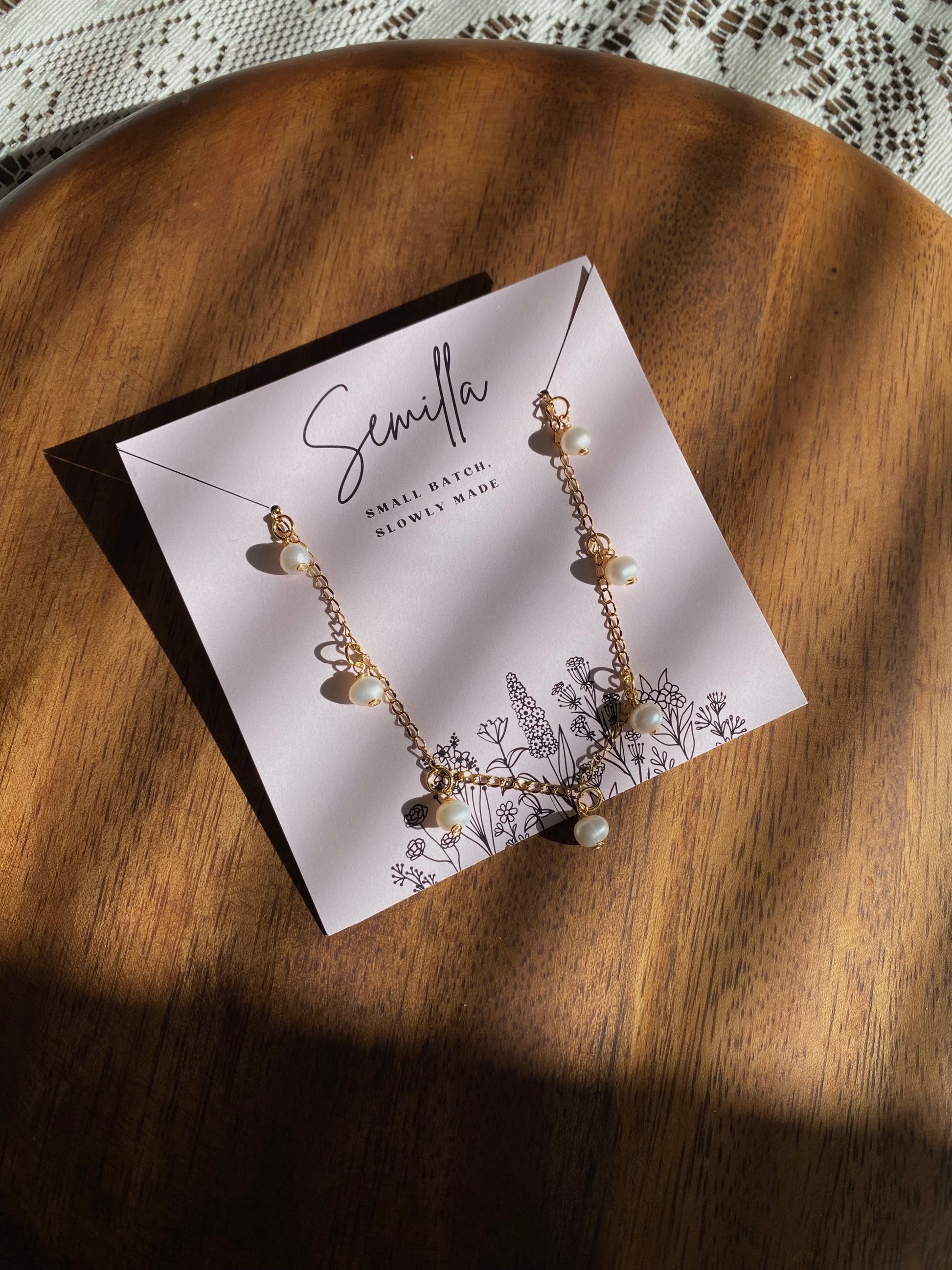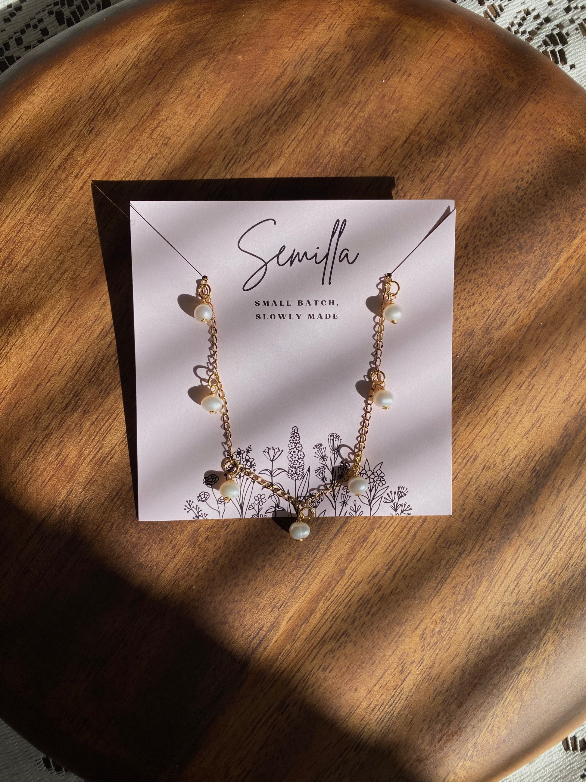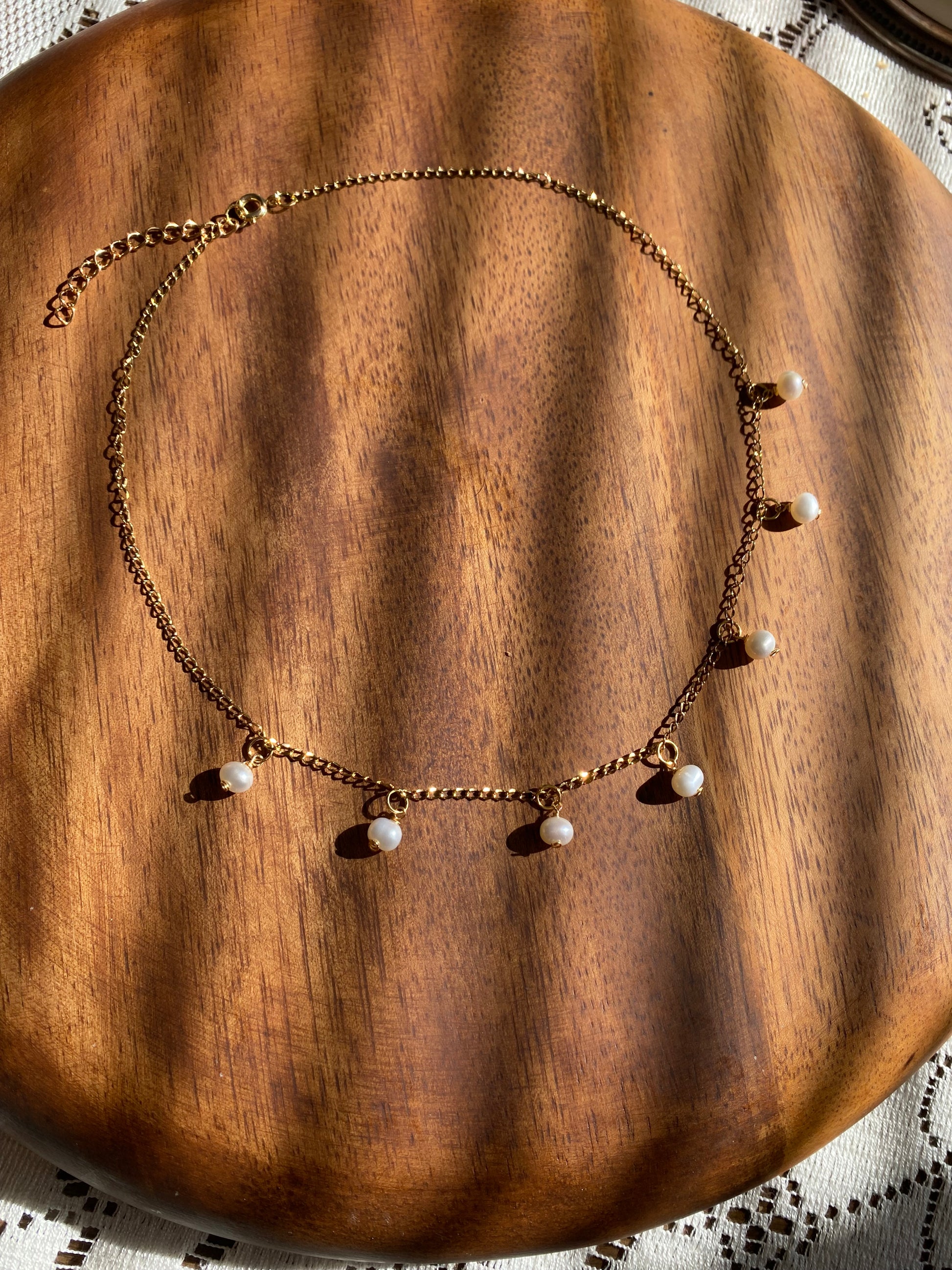 7 freshwater pearl charms dangling from a gold-plated chain. Gold-plated findings, 18 inches + 2 inch extender