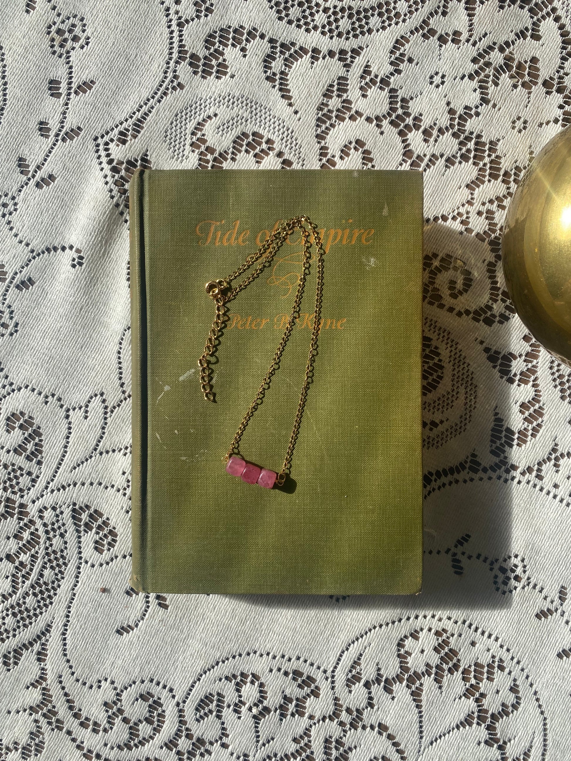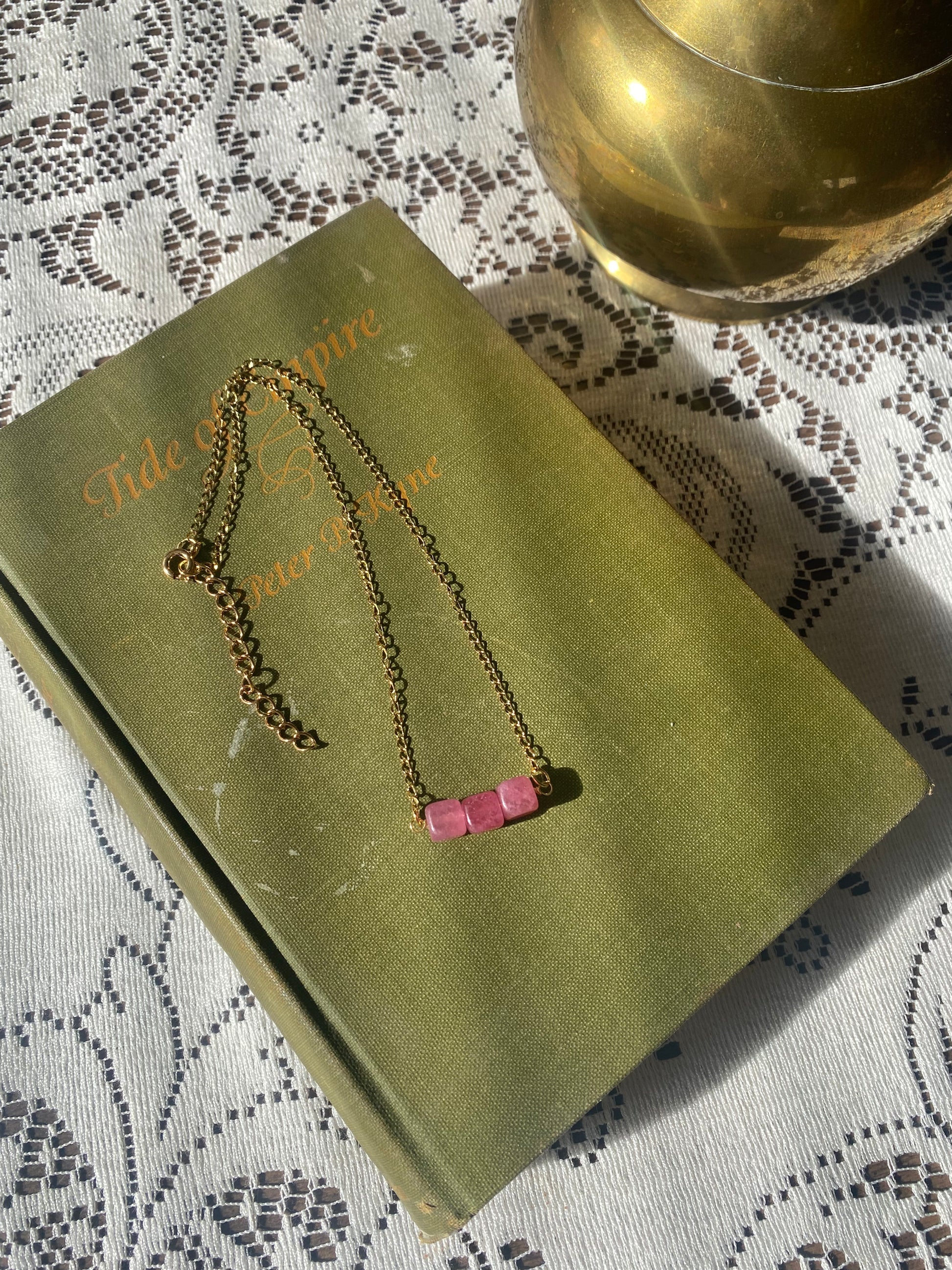 Three pink quartz beads strung on gold plated, stainless steel chain. 15 inches plus 2 inch extender.